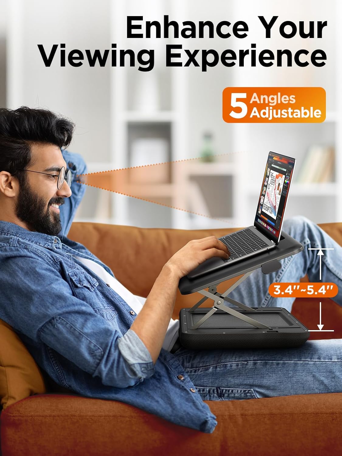 Das SAIJI Augenhöhe Laptopkissen bietet eine höhen- und winkelverstellbare Plattform für Laptops bis 17 Zoll, ideal für Arbeiten und Entspannen im Homeoffice. Die robuste Aluminiumbeinkonstruktion gewährleistet Stabilität, während das dick gepolsterte Kissen Druck von den Beinen nimmt. Mit innovativen Klemmen lässt sich das Kissen schnell auf fünf Höhen (4 bis 14,7 cm) und einen Winkel von 0° bis 27° anpassen. Zubehör ist in der integrierten Schublade verstaubar.