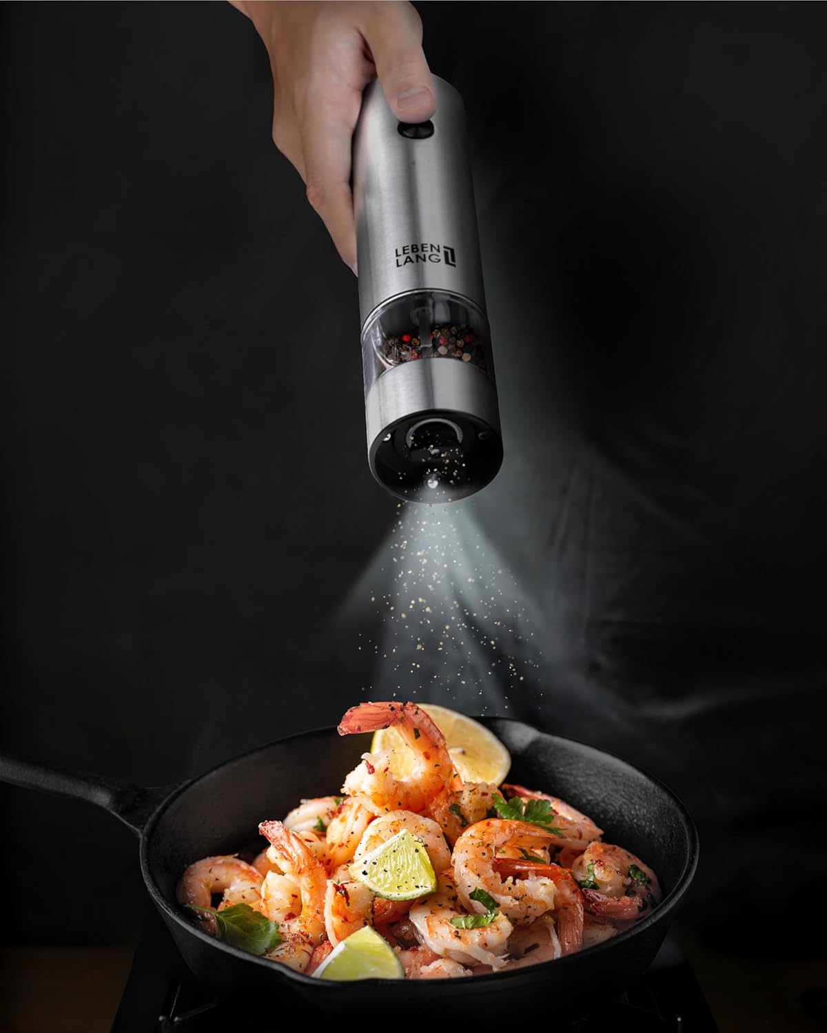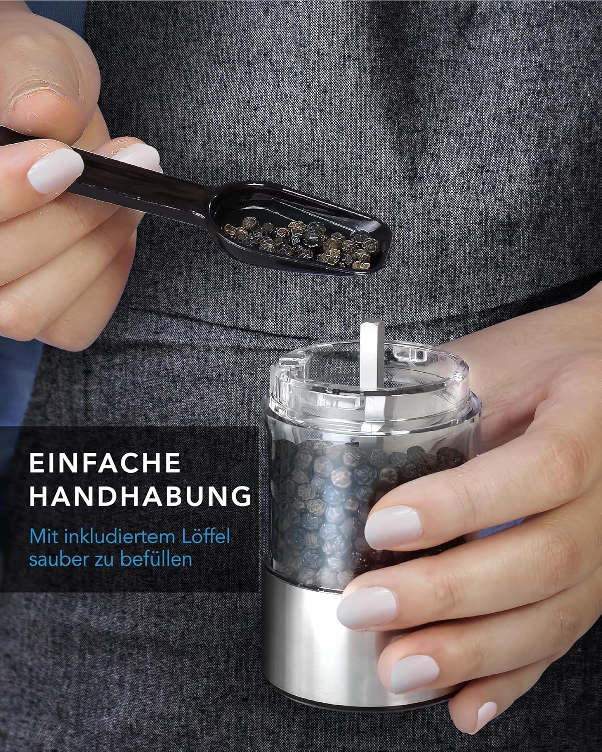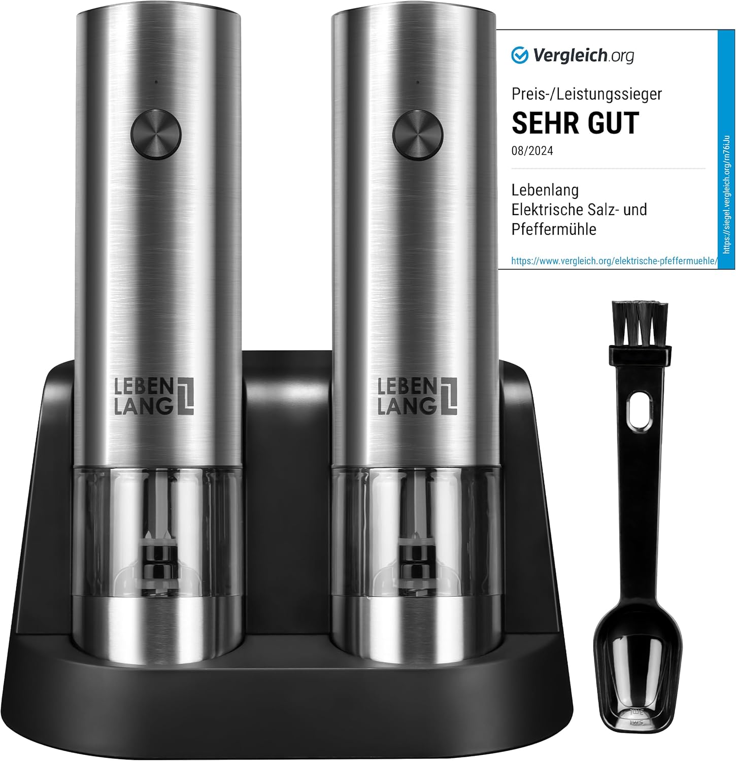 Das LEBENLANG Salz- und Pfeffermühlen-Set ist mit präzisen Keramikmahlwerken ausgestattet und ermöglicht eine exakte Körnungseinstellung, während eine integrierte LED-Leuchte die Dosierung erleichtert. Es umfasst eine trennbare Basisstation, einen USB-C-Anschluss zum Wiederaufladen des Lithium-Ionen-Akkus, sowie einen Reinigungspinsel und Einfüll-Löffel.