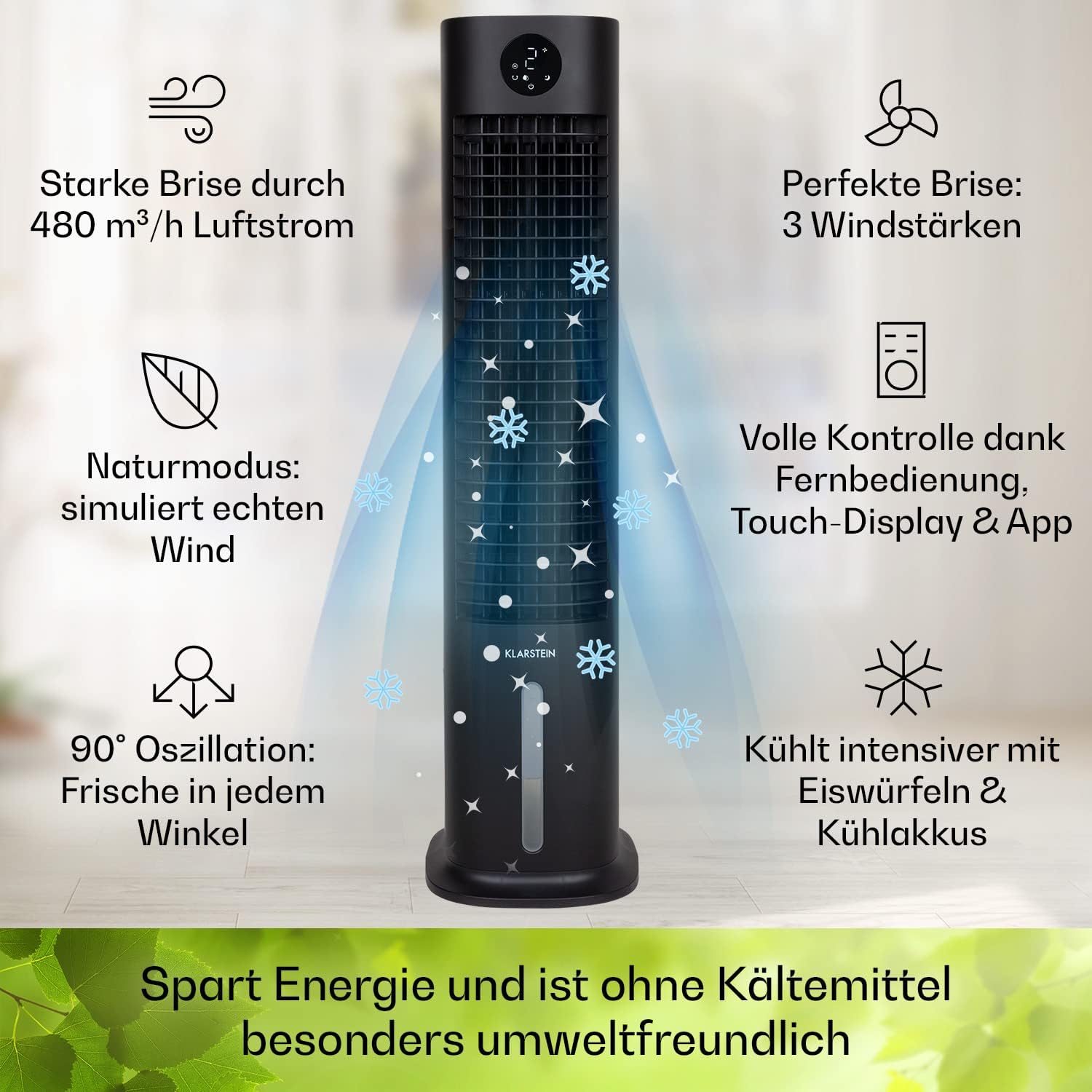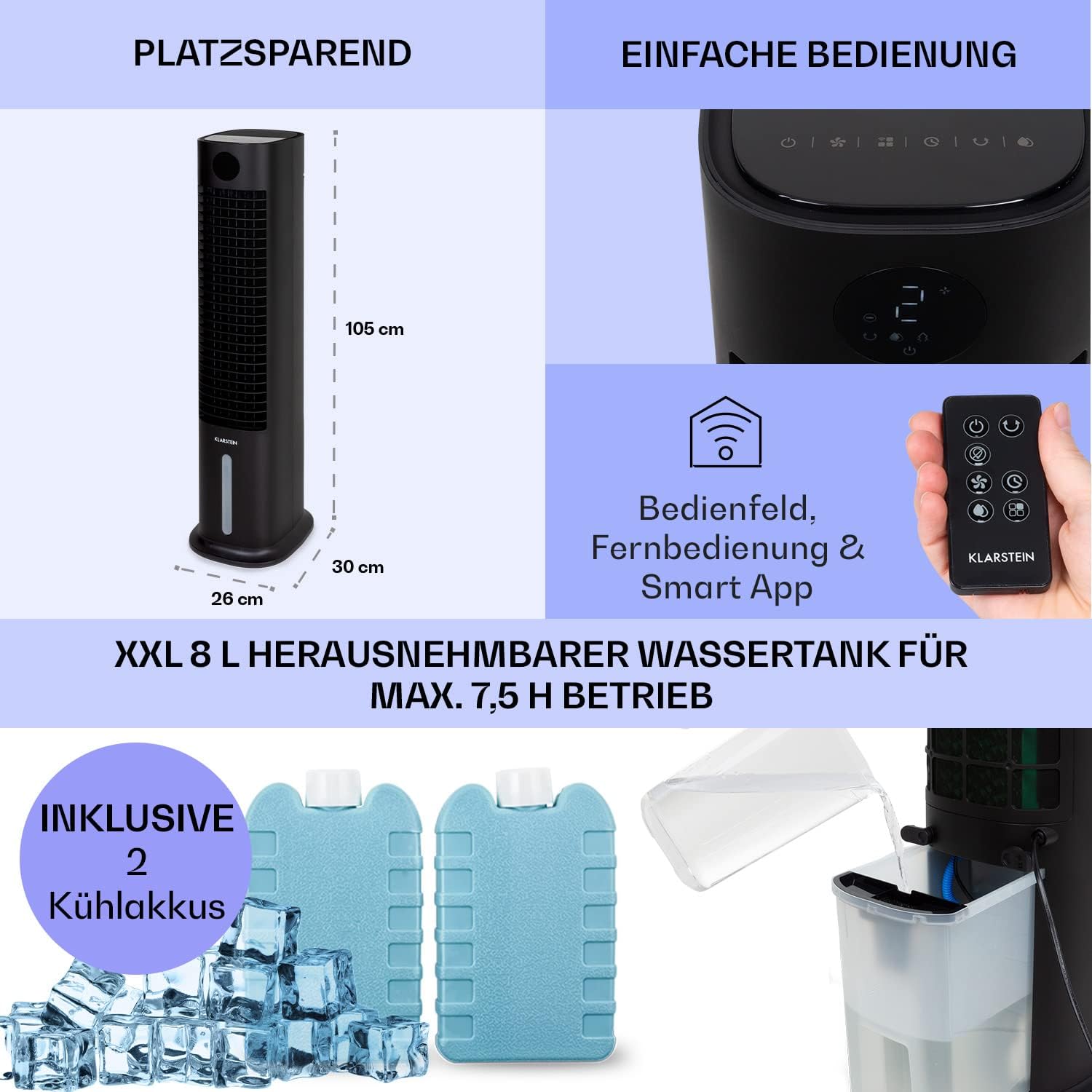 Der Klarstein Grand Smart Luftkühler bietet umfassende Funktionalität in einem Gerät – es agiert als Verdunstungskühler, Luftbefeuchter, Ventilator sowie Luftreiniger und ist zudem mit einer App für die smarte Steuerung ausgestattet. Mit einer Leistung von 80W und einem Luftstrom von 462m³/h sorgt das Gerät für eine effiziente Raumkühlung. Dank vier Geschwindigkeitsstufen, einem 8-Liter-Wassertank und 80° Oszillation, verteilt es gekühlte Luft gleichmässig und bietet mit Normal-, Natur- und Nachtmodus flexible Betriebsarten. Im Lieferumfang ist eine Fernbedienung und 2 Kühlakkus enthalten.