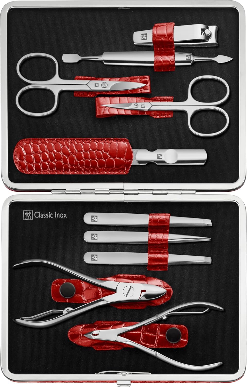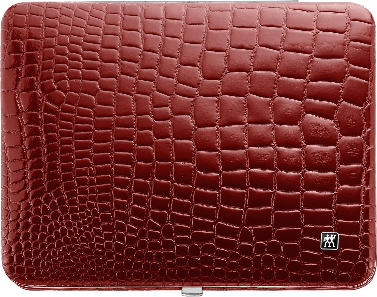 Das ZWILLING Manikürest in der Kroko Edition, gehüllt in ein rotes Rindleder-Etui mit edlem Metallrahmen, präsentiert sich als eine exquisite Auswahl an hochwertigen Pflegeinstrumenten. Das 10-teilige Komplettset, einschliesslich Nagelknipser, unterschiedlichen Pinzetten, Scheren, einer Nagelzange sowie einer Saphir-Nagelfeile, ist aus poliertem, rostfreiem Edelstahl gefertigt. Die ergonomische Form der Werkzeuge macht sie zum perfekten Begleiter für die tägliche Routine zu Hause oder auf Reisen.