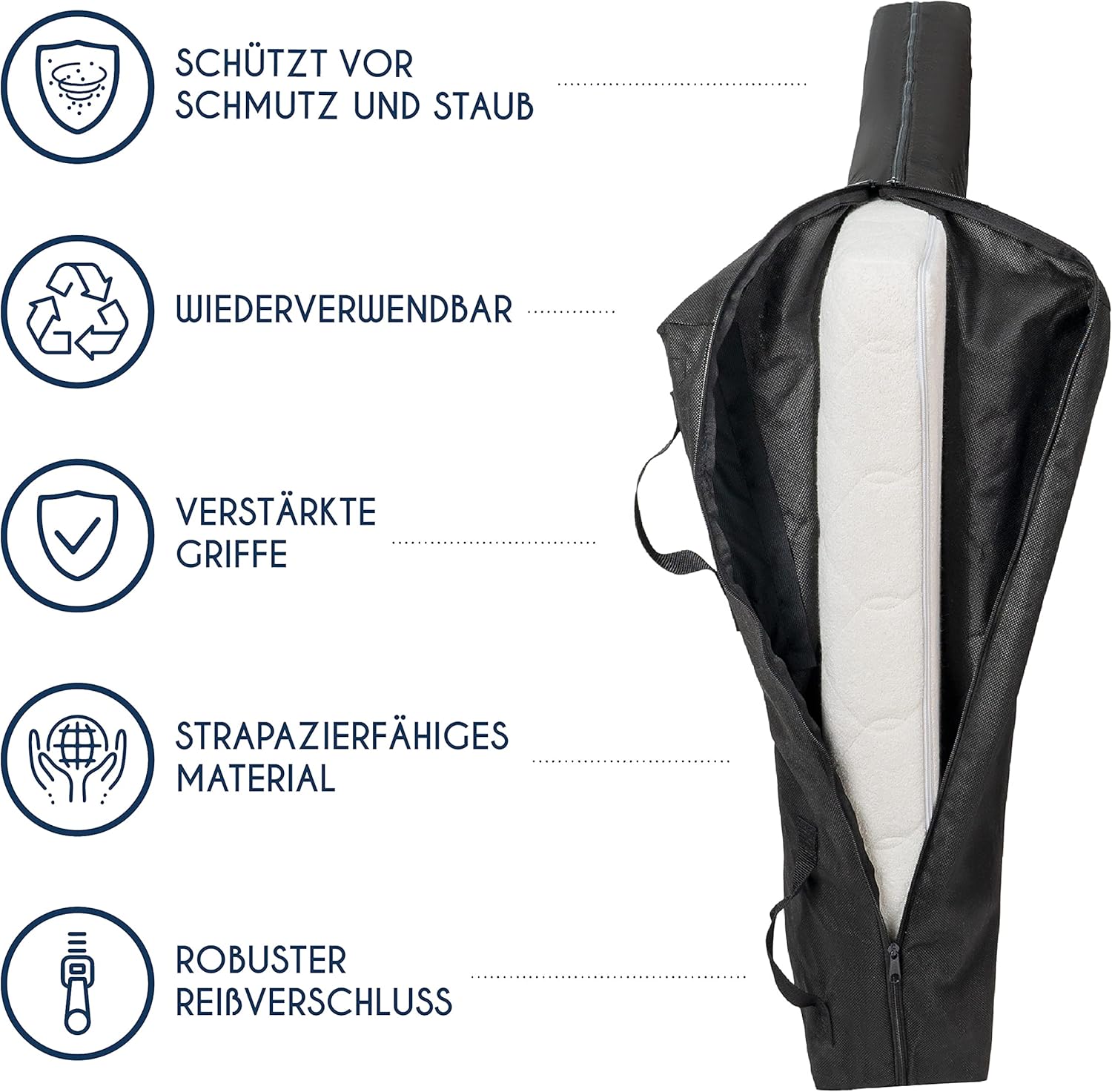 Die Dreamzie Matratzenhülle, geeignet für Matratzen mit den Massen 140 x 200 cm und einer Dicke von 30 cm bietet idealen Schutz für Matratzen während der Lagerung oder eines Umzugs. Das robuste und unempfindliche Polypropylenmaterial isoliert gegen Ungeziefer und Feuchtigkeit und ist darüber hinaus wiederverwendbar. Mit einem 3-seitigen Reissverschluss und stabilen Griffen ausgestattet, vereinfacht die Hülle sowohl das Überziehen als auch den Transport der Matratze.