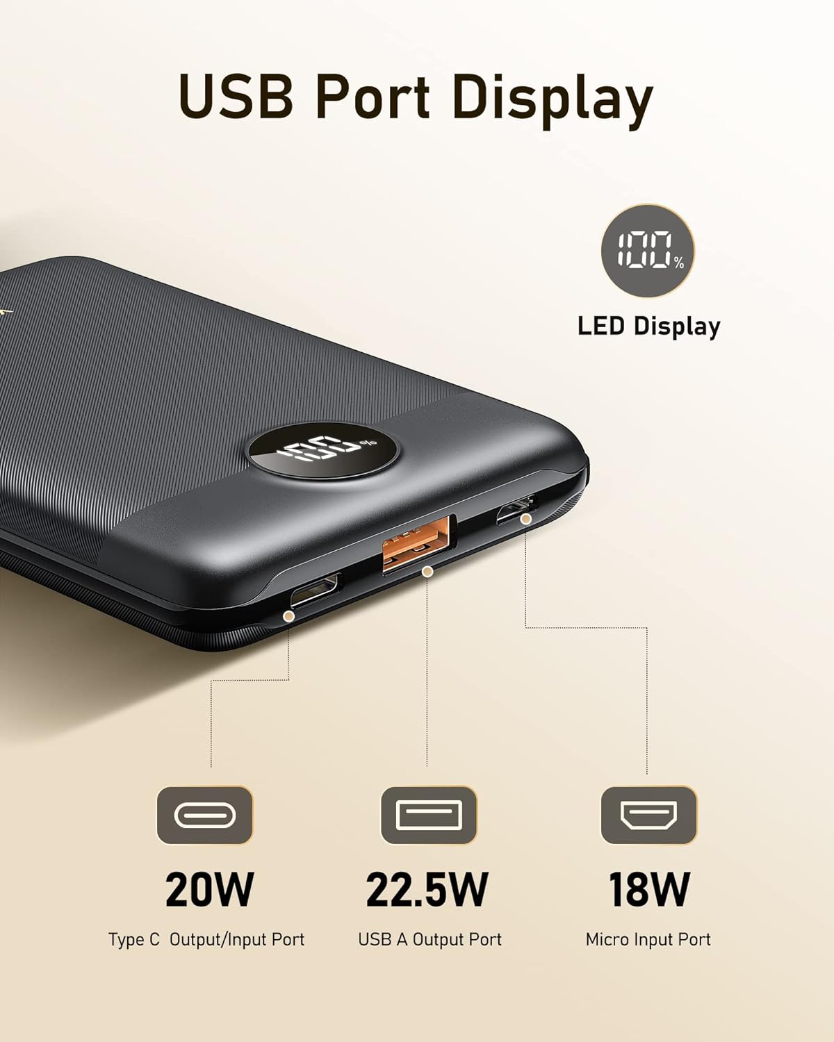 Die VEEKTOMX Power Bank ist ein kompakter und leistungsstarker 10000mAh Akku. Diese Power Bank ist in der Lage Smartphones, Ipads, Airpods oder ähnliches aufzuladen. Ausgestattet mit einem QC3.0 18W kompatiblen USB-A-Anschluss und einem Typ-C-Anschluss, der PD/QC 3.0 bis zu 20W unterstützt, stellt die Mini Power Bank ein vielseitiges Ladegerät dar, das zwei Geräte gleichzeitig aufladen kann. Die Powerbank verfügt zudem über eine praktische LED-Anzeige, die den Nutzern den verbleibenden Akkustand und den Ladezustand anzeigt, und ist mit Micro-USB- oder USB-C-Eingängen ausgestattet, sodass sie in nur 4,5 Stunden mit einem 3-A-Ladegerät voll aufgeladen werden kann.