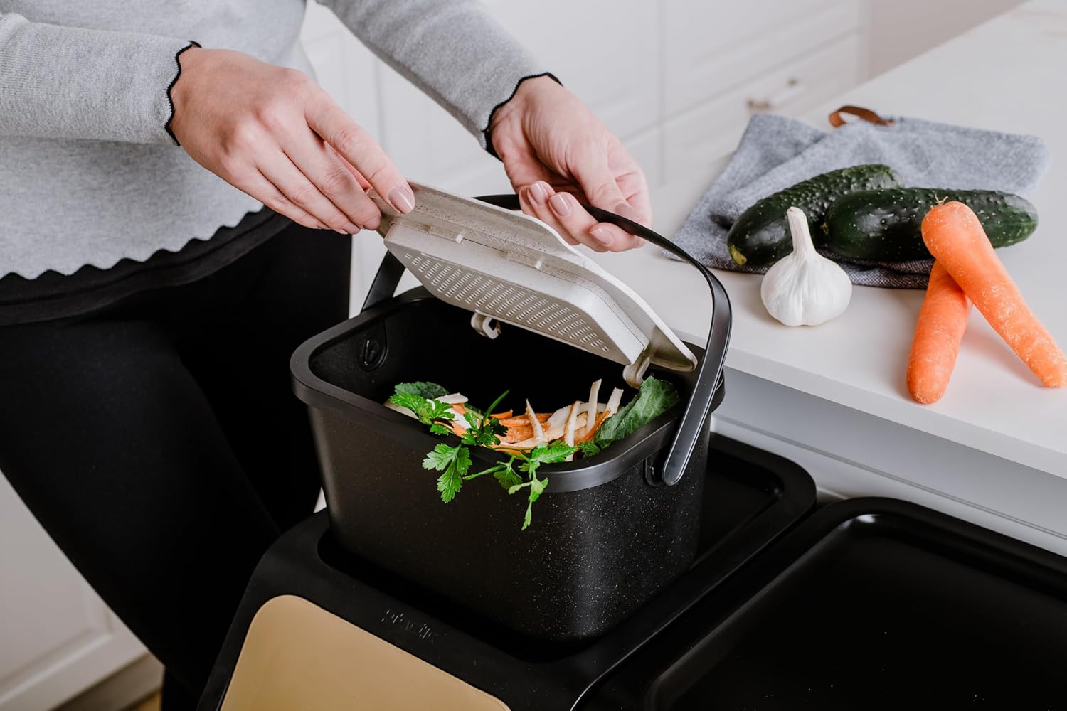 Der Komposteimer Mini Bini von Go Practic verfügt über ein Fassungsvermögen von 4,5 Litern. Der Behälter ist mit einem Deckel ausgestattet, der sich über eine Click-Funktion einfach öffnen und schliessen lässt. Abgerundete Ecken sowie glatte Innenwände ermöglichen eine unkomplizierte Reinigung auch ohne die Verwendung von Müllbeuteln. Ein integrierter Aktivkohlefilter reduziert die Geruchsbildung.