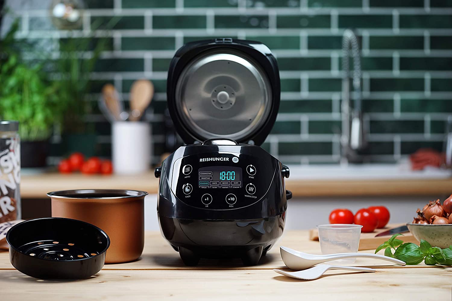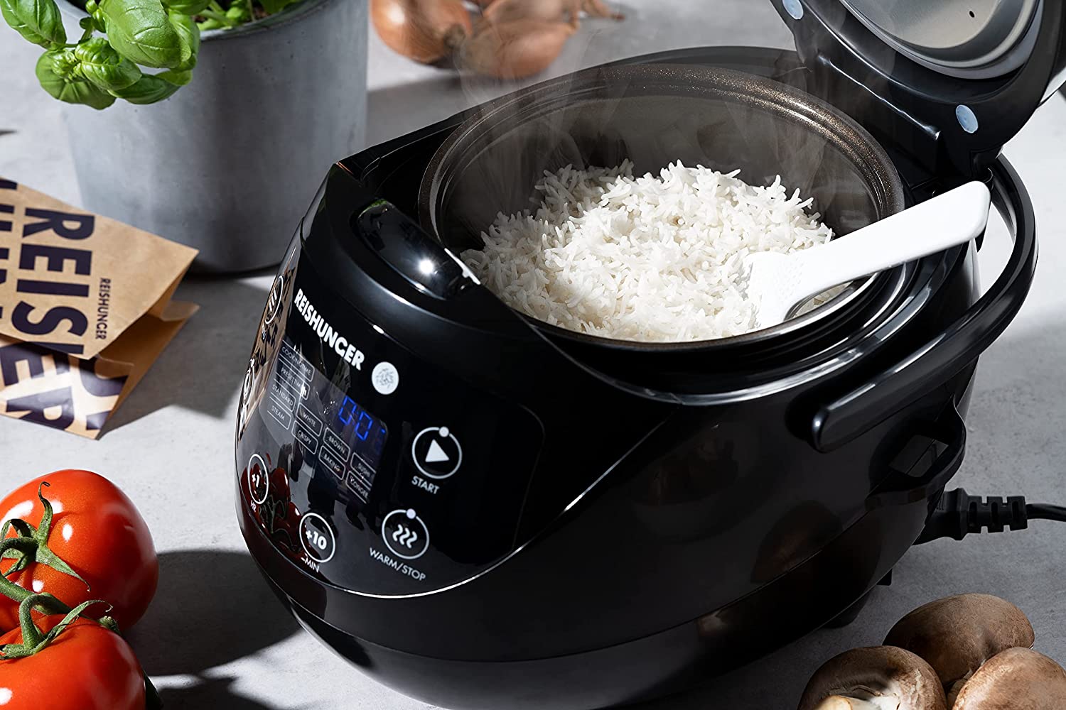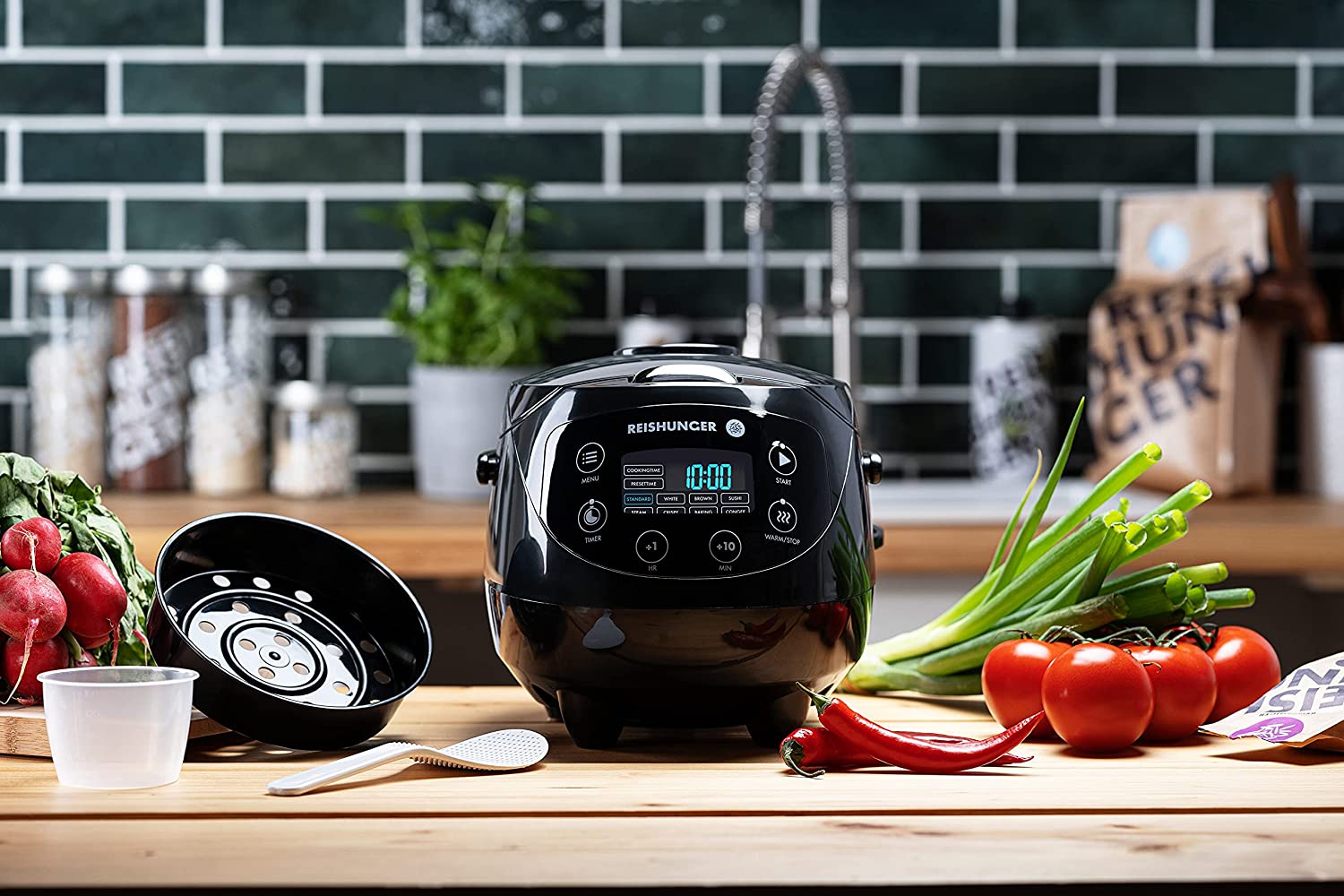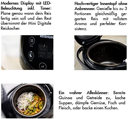 Volles Reisaroma, perfekte Konsistenz und nährstoffschonende Zubereitung dank bahnbrechender 7-Phasen-Kochtechnologie. Schonende und gleichmässige Zubereitung über eine dynamische Hitzezufuhr. Herrlich leckeren Reis zur Wunschzeit mit intuitiver Bedienung. Mit der Timer Taste kannst du den Kochvorgang um bis zu 24h verzögern. Nach dem Kochen springt der Reiskocher automatisch in den Warmhaltemodus. Damit gelingen dir nicht nur Reis Spezialitäten wie Sushi oder Tahdig (persischer Krustenreis) auf Knopfdruck. Du kannst auch noch Quinoa oder andere Getreidesorten zubereiten, Gemüse, Fisch und Fleisch dämpfen oder einen Kuchen backen. Stabiler Innentopf mit praktischen Henkeln und hochwertiger Antihaftbeschichtung aus Keramik. 3D-Hitzeverteilung für gleichmässig und perfekt gegarten Reis.