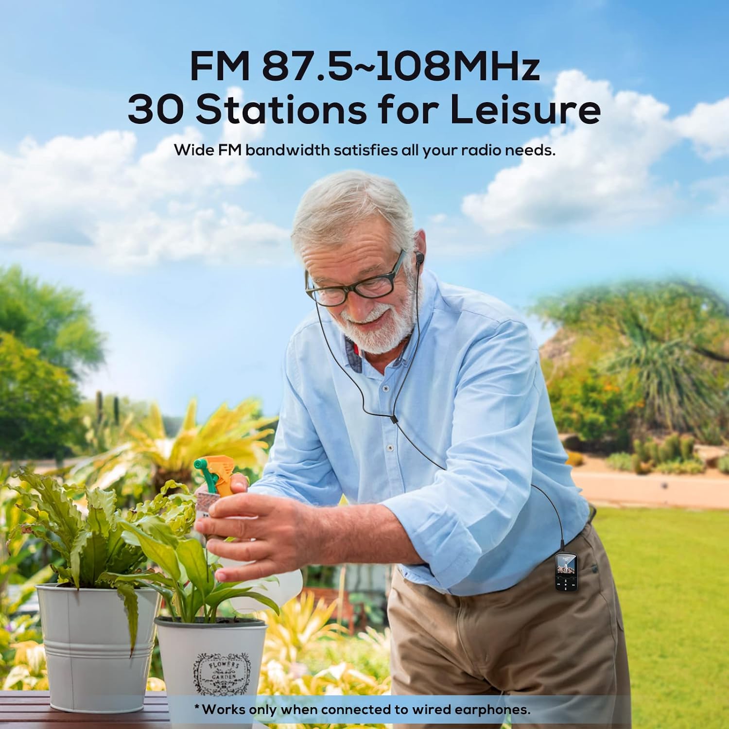 Dieser vielseitige tragbare Player in der Farbe Schwarz bietet eine FM-Bandbreite von 92-108 MHz, die bis zu 30 Radiosender empfängt. Die FM-Funktion erfordert kabelgebundene Kopfhörer als Antenne. Zusätzlich dient der Player als Diktiergerät, um wichtige Informationen aufzunehmen. Mit einer Akkulaufzeit von bis zu 30 Stunden für Musikwiedergabe (bei vollständiger Ladung von 2 Stunden) und einer E-Book-Funktion für das Lesen von TXT-Formaten ist er ideal für unterwegs. Mit der Möglichkeit, Musik von einer SD-Karte abzuspielen und praktischen Funktionen wie automatischem Herunterfahren und Bildschirmsperre bietet er eine komfortable Bedienung. Ausserdem kann der Player als Schrittzähler fungieren. Der MP3-Player verfügt zudem über Bluetooth 5.0 und ist mit 16 GB Speicherplatz ausgestattet. Für diejenigen, die mehr Speicherplatz benötigen, unterstützt der Micro-SD-Kartensteckplatz bis zu 128-GB-Karten. Die Bildformate sind JPEG, BMP, GIF während die Audioformate MP3 und WAV sind.