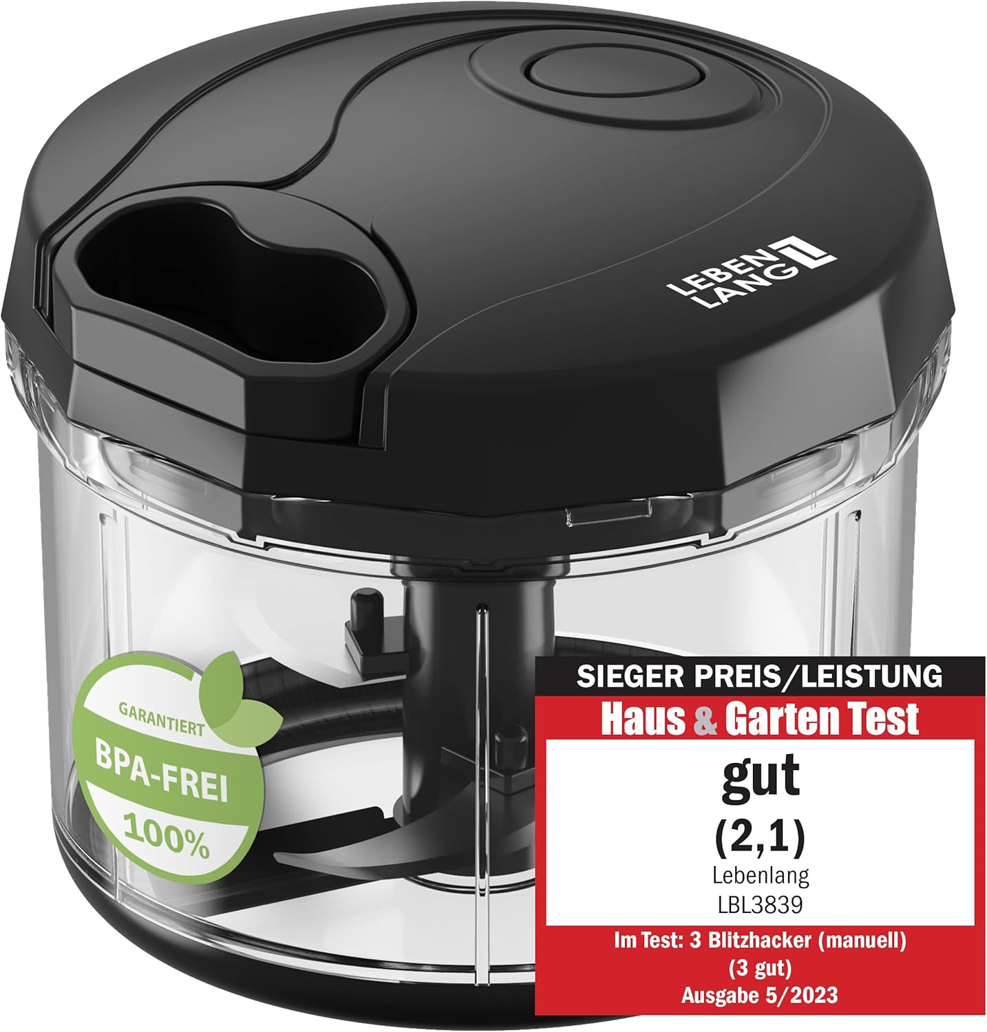 Der LEBENLANG Gemüse & Zwiebelschneider eignet sich für das schnelle und sichere Zerkleinern von Zutaten. Ausgestattet mit einem 1-Liter-Fassungsvermögen, ermöglicht es dank der drei scharfen Smart Cut Edelstahlklingen, binnen Sekunden perfekte Ergebnisse zu erzielen - von Zwiebeln über Knoblauch bis zu Obst und Kräutern. Der robuste Mechanismus mit praktischem Seilzug garantiert dabei ein gleichmässiges Schneidebild. Der handliche Chopper zeichnet sich durch eine Bodengummierung aus, die während der Benutzung für einen festen und rutschsicheren Stand sorgt. Zudem wird das Gerät mit einem Frischhaltedeckel geliefert, der das Aufbewahren von zubereiteten Speisen erleichtert. Ausserdem ist ein Mixer für das Anmischen von Saucen und Rührei enthalten. Das Material des Multizerkleinerers ist 100 % BPA-frei, was die Sicherheit und Gesundheit in der Küche unterstützt.