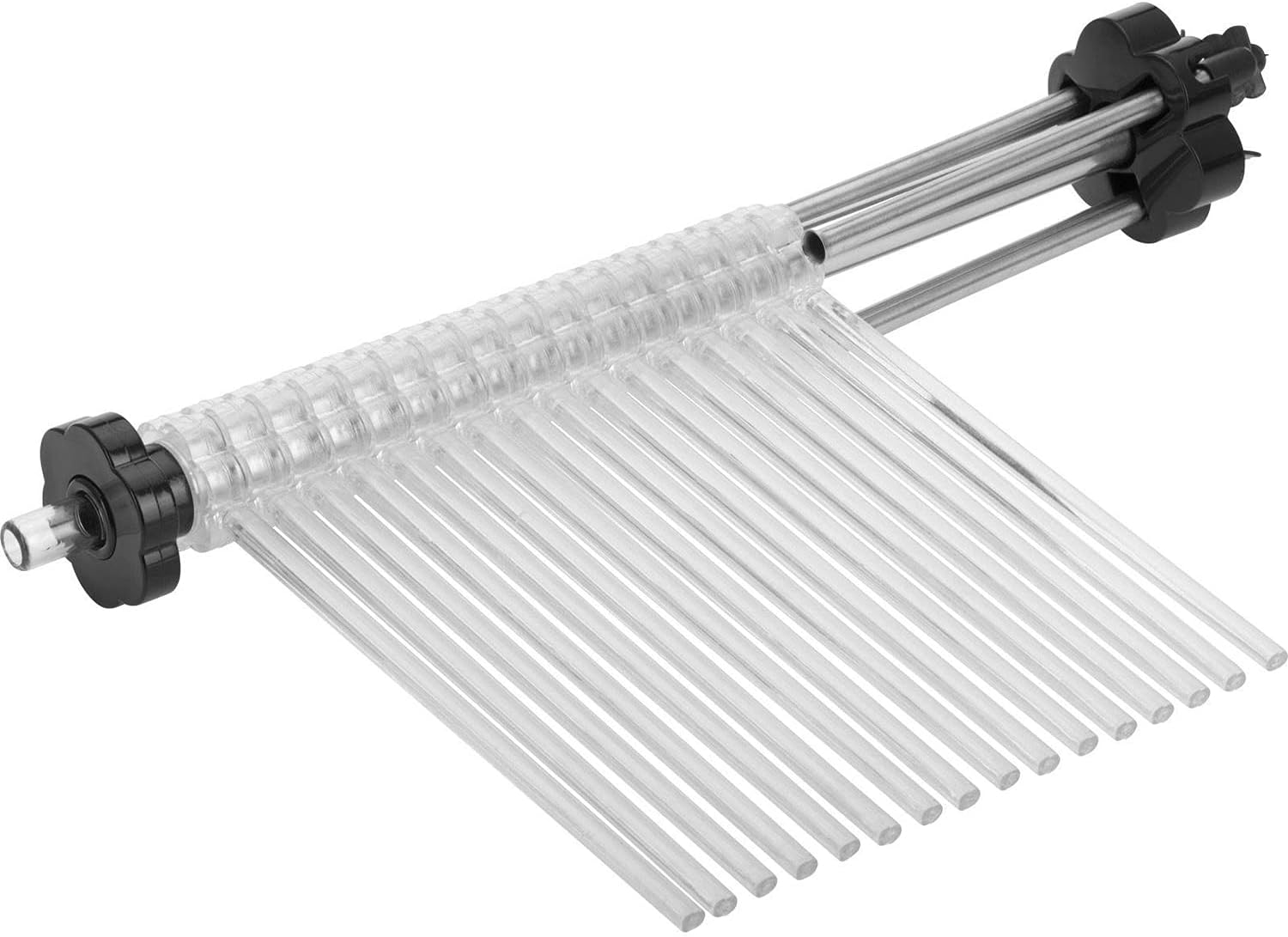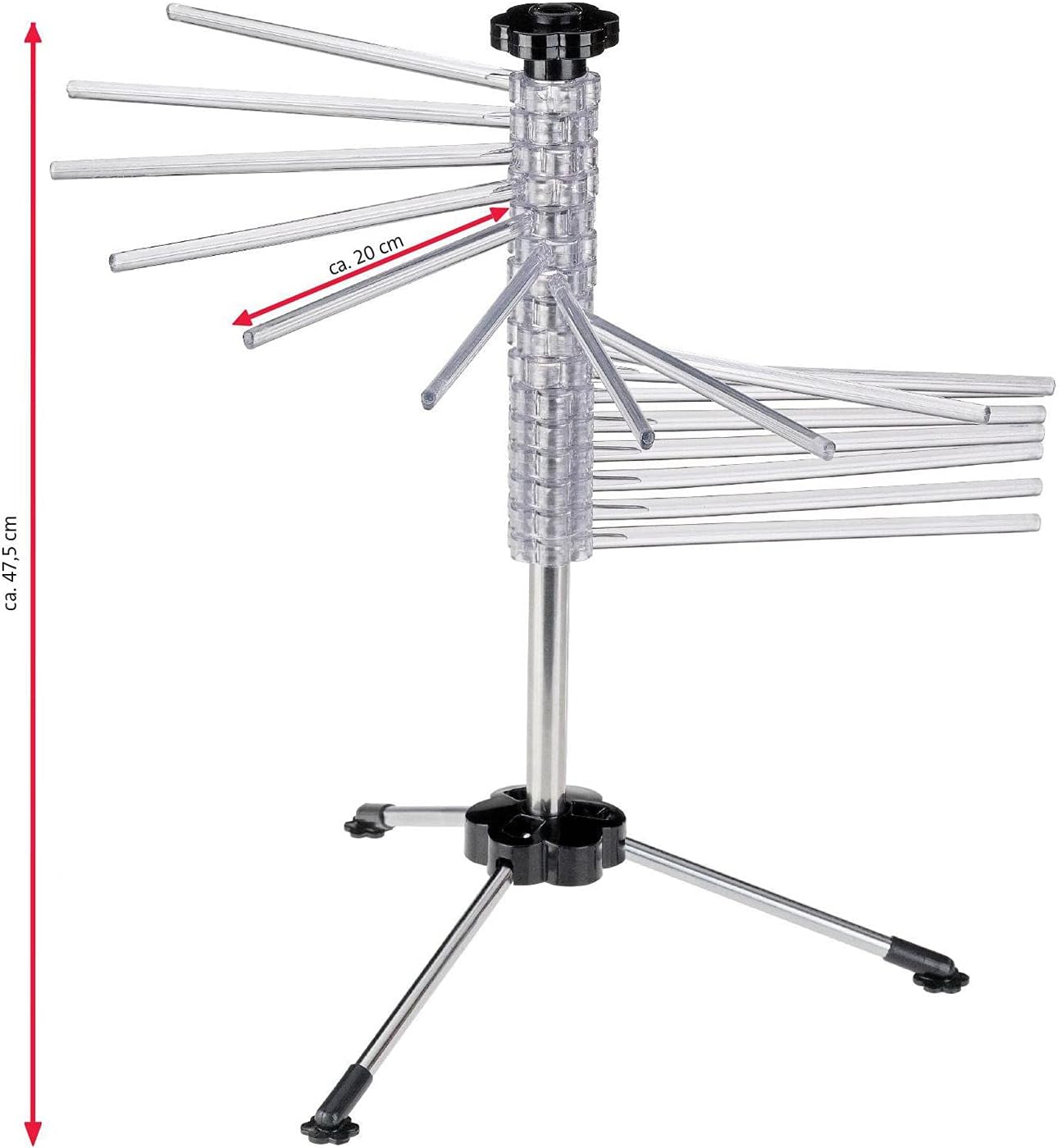 Der Nudeltrockner ist die ideale Lösung zum Aufhängen frisch hergestellter Nudeln. Es enthält 16 transparente Trockner-Stäben mit einer Länge von je 20 cm. Durch das einfache Auffächern der Trocknerstäbe mit dem schwarzen Griff können die Nudeln stufenweise aufgehängt werden, ohne mit anderen Nudeln zu verkleben. Der Nudeltrockner wird mit einem praktischen Transport-Stab geliefert, der den Weg zwischen Nudelmaschine und -ständer erleichtert. Die 3 zusammenklappbaren Beine mit Gummifüssen sorgen für einen sicheren Stand. Der Nudeltrockner hat eine Höhe von ca. 47.5 cm.