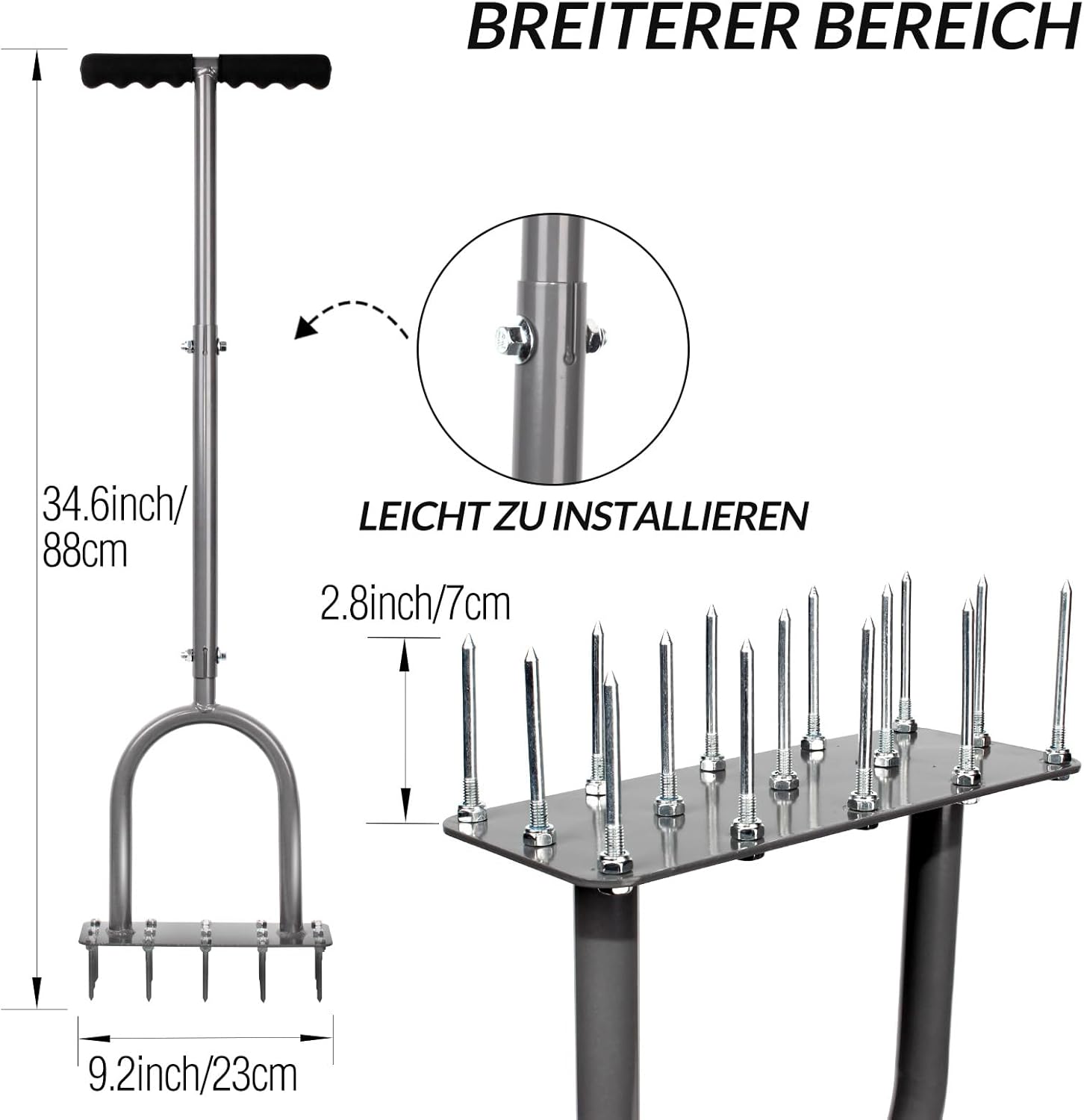 Der Walensee Rasenlüfter verkörpert eine effiziente Lösung für die Pflege und Belüftung von Gärten und Höfen. Mit 15 scharfen, 7 cm langen Eisen-Spikes bietet dieses manuelle Gerät eine bemerkenswerte Arbeitsökonomie, die Zeit und Aufwand spart. Die robuste Eisenkonstruktion ist mit einer langlebigen Pulverbeschichtung versehen, welche Rostbeständigkeit sicherstellt. Der 88 cm lange Gartenlüfter ermöglicht schonendes Arbeiten durch seine ergonomisch gestaltete T-Griffstange und das Pedal, welches durch Hebelwirkung das Eindringen der Spikes in den Boden erleichtert. Das Gerät erweist sich als besonders nützlich für verschiedene Bodenarten, wie Ton, Sand oder Lehm. Montage und Demontage erfolgen einfach und schnell, was nicht nur den Installationsprozess, sondern auch den Transport erleichtert.