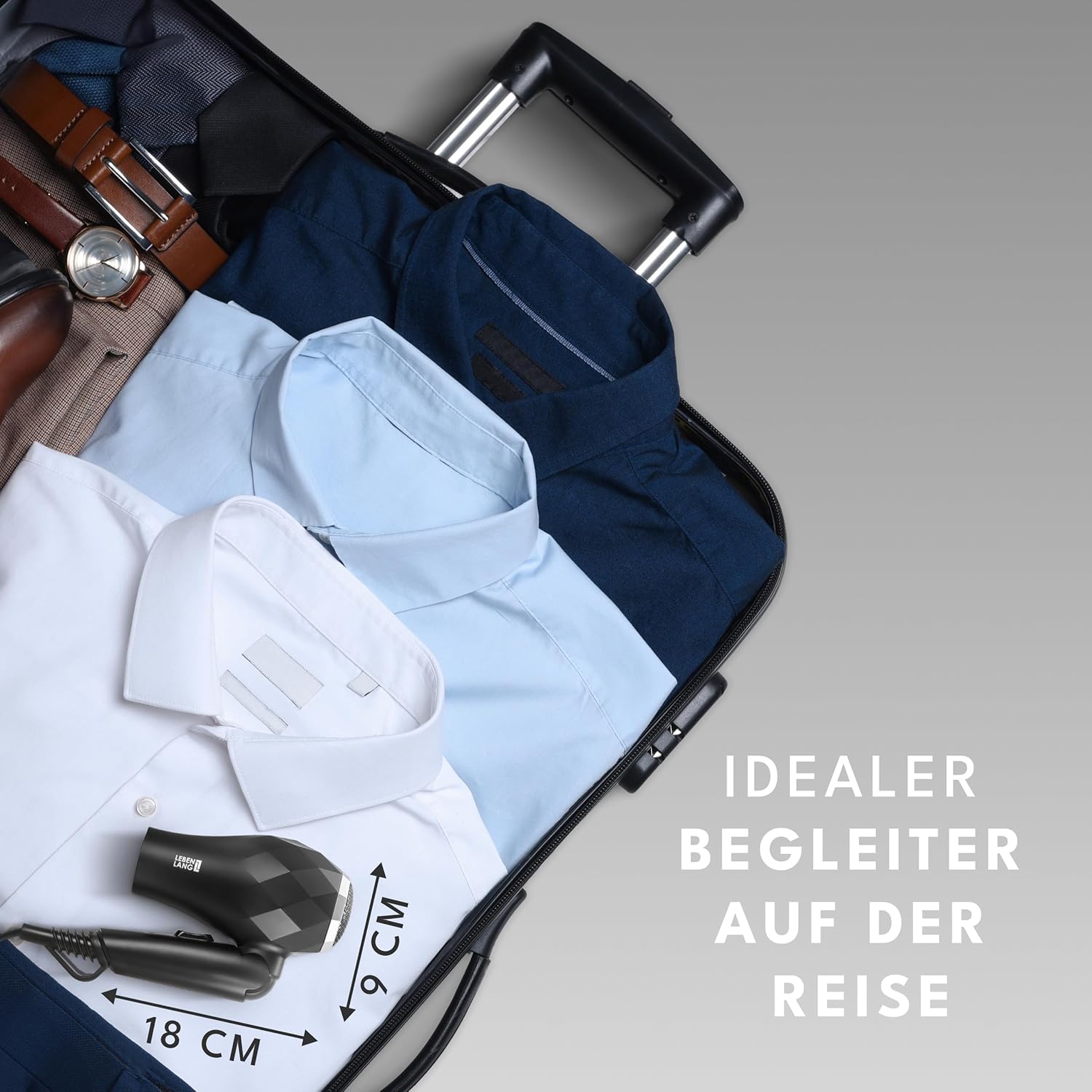 Der LEBENLANG Reisefön (1000 Watt) vereint Mobilität mit Leistung in einem kompakten, klappbaren Design. Dieser Haartrockner in Schwarz / Silber wiegt 400 g und besticht durch seine moderne Optik mit Diamant-Facetten. Im Lieferumfang enthalten sind eine praktische Reisetasche sowie eine Stylingdüse. Mit seinen Massen von 17 x 6,6 x 22 cm lässt sich der leise Föhn einfach verstauen. Ideal für unterwegs oder den Gebrauch daheim.