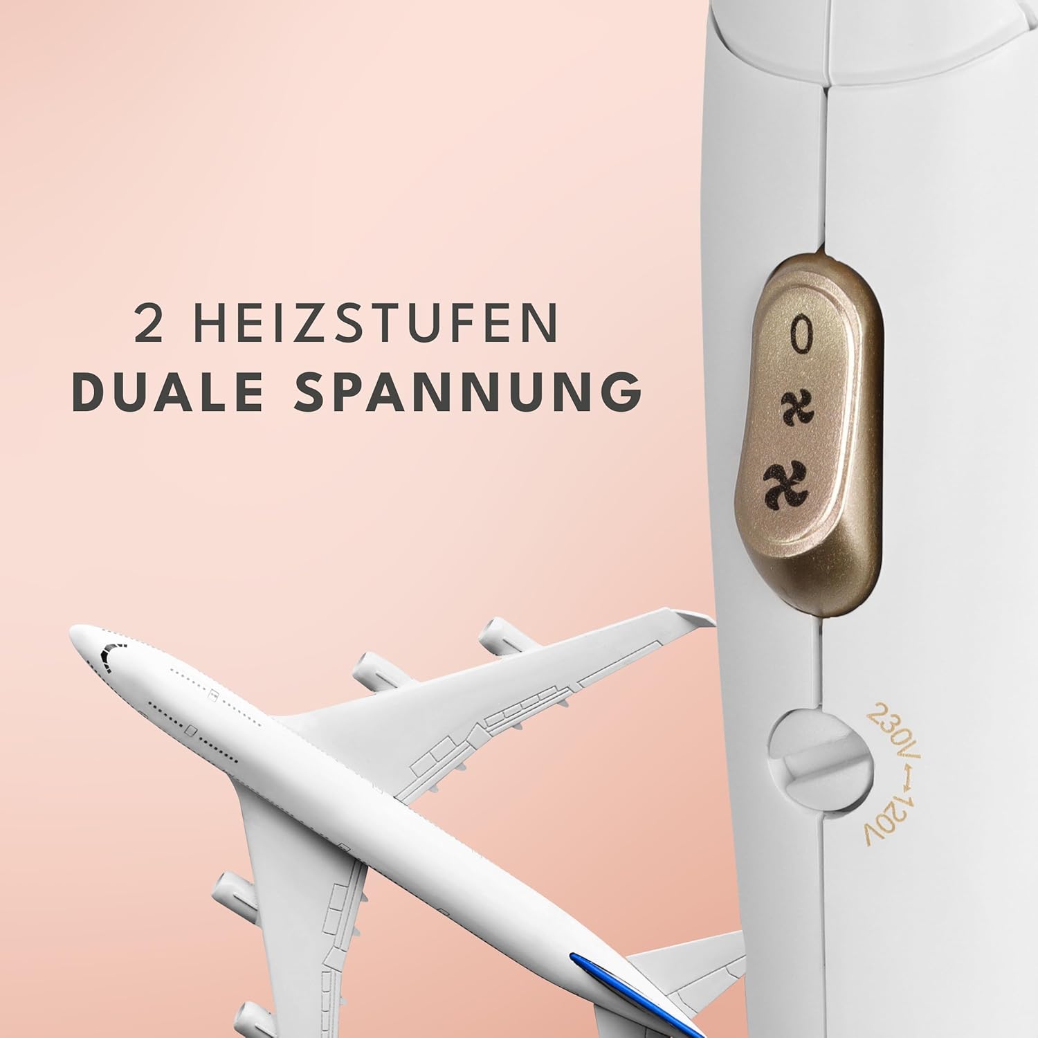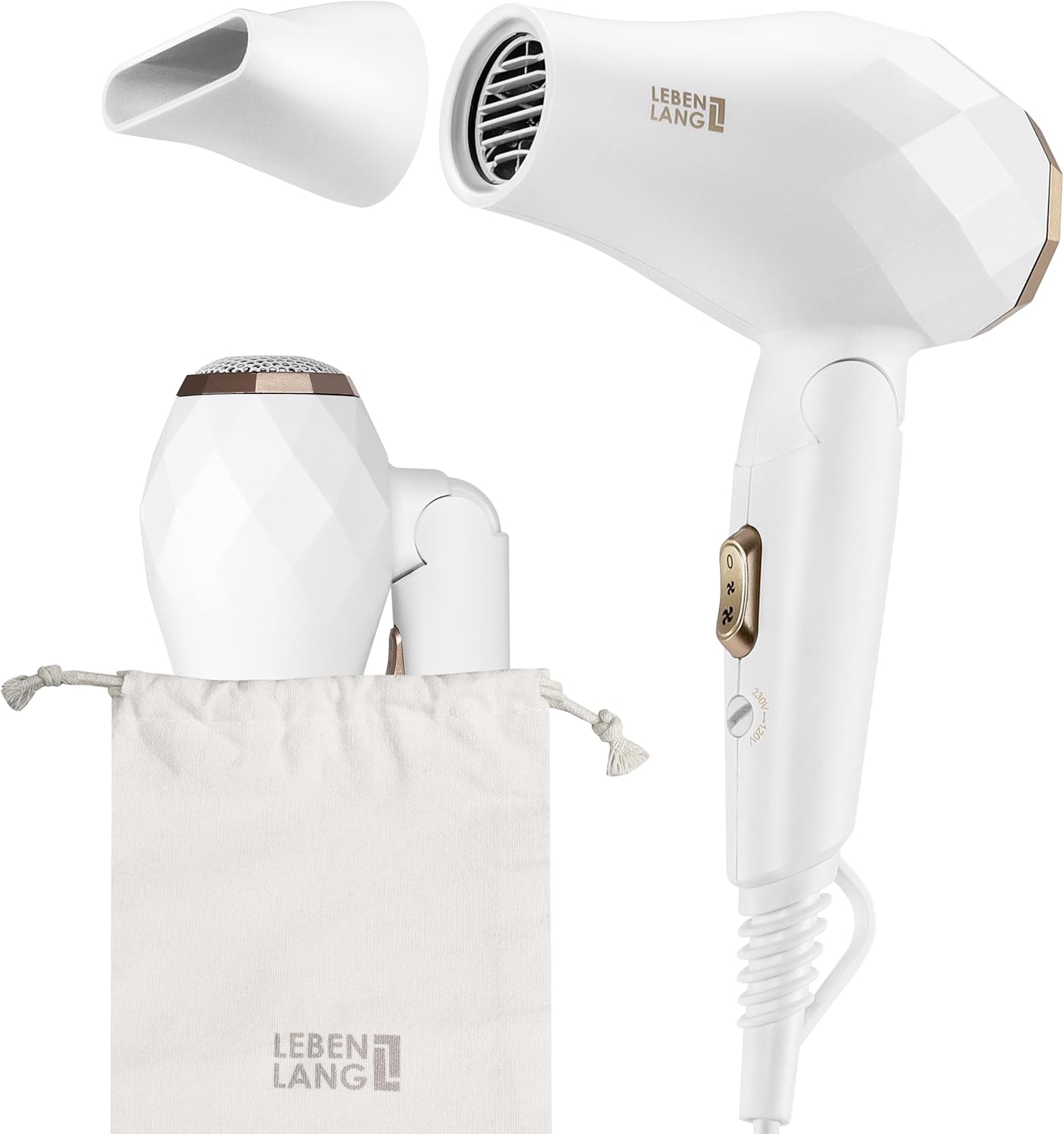 Der LEBENLANG Reisefön (1000 Watt) vereint Mobilität mit Leistung in einem kompakten, klappbaren Design. Dieser Haartrockner in Weiss/Gold wiegt 400 g und besticht durch seine moderne Optik mit Diamant-Facetten. Im Lieferumfang enthalten sind eine praktische Reisetasche sowie eine Stylingdüse. Mit seinen Massen von 17 x 6,6 x 22 cm lässt sich der leise Föhn einfach verstauen. Ideal für unterwegs oder den Gebrauch daheim.