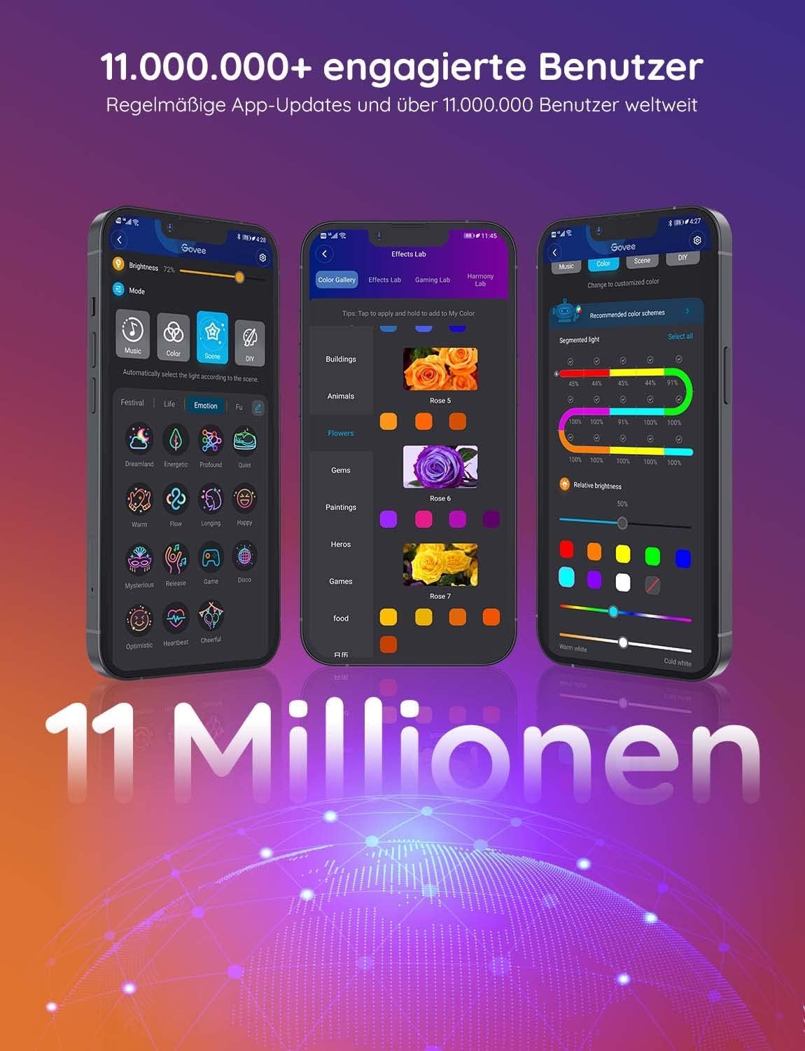 Die RGBIC LED Streifen sind speziell für den Innenbereich konzipiert und bieten vielseitige Beleuchtungsmöglichkeiten. Die zwei Rollen mit jeweils 10 Metern Länge ermöglichen eine Gesamtlänge von 20 Metern und bestehen aus robustem Kunststoffmaterial. Die RGBIC-Lichtfarbe der Streifen erlaubt eine intensive und abwechslungsreiche Farbdarstellung. Eine intelligente Bluetooth-APP-Steuerung ermöglicht es, die Beleuchtung einfach anzupassen. Die LED Streifen verfügen über 360 Lampen und arbeiten mit einer Eingangsspannung von 9,11 Volt. Die Besonderheiten umfassen RGBIC und Segmentcontrol, einen erweiterten Musikmodus, einen DIY Modus, 64 Szenenmodi, Farbwechsel, einen praktischen Timer-Modus und sind dimmbar. Sie sind nicht zur allgemeinen Beleuchtung gedacht, sondern zur Schaffung von stimmungsvollen Atmosphären. Der Lieferumfang beinhaltet ein Benutzerhandbuch, eine Kontrollbox, zwei LED RGBIC Streifen mit jeweils 10 Metern Länge und einen Adapter.