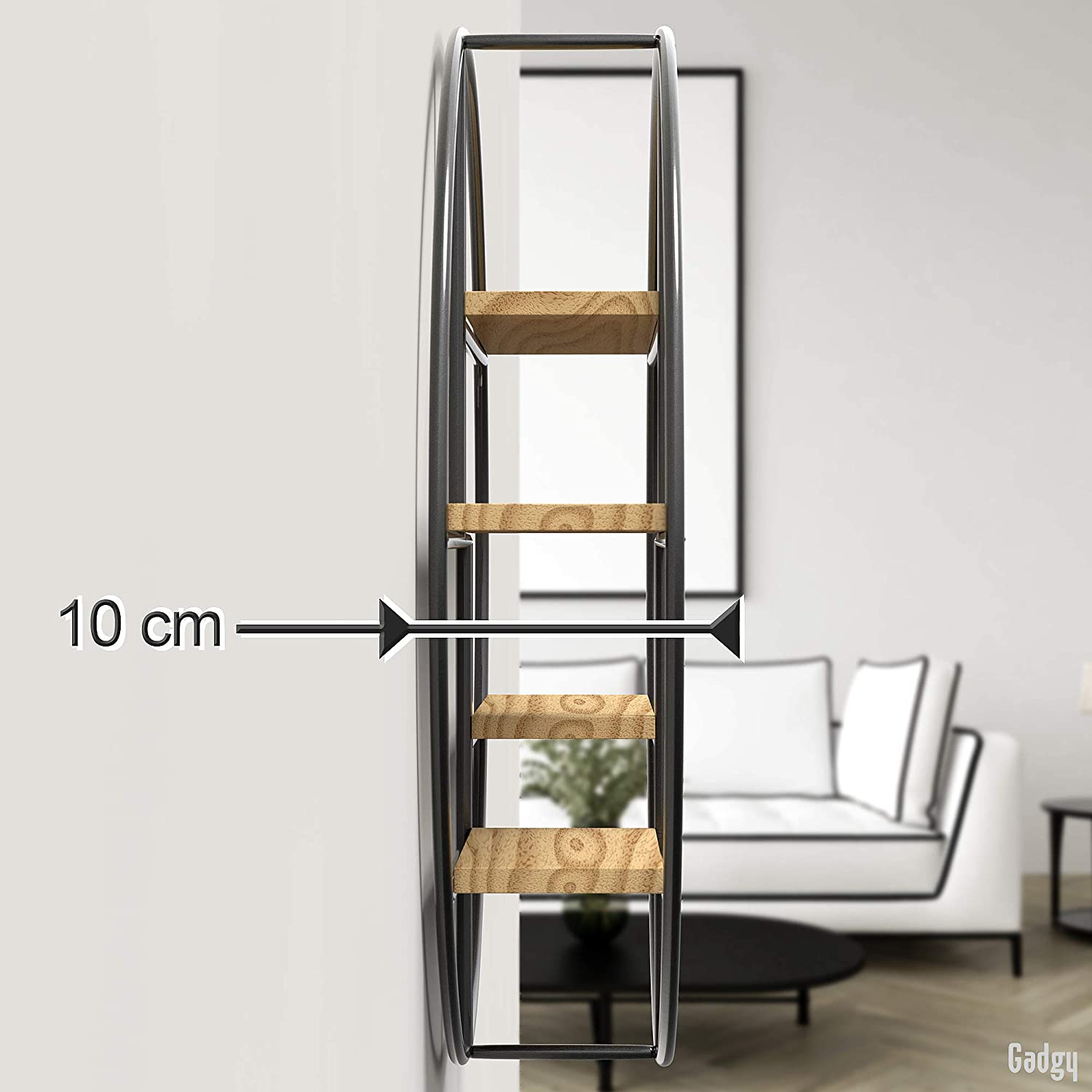 Das Wandregal ist rund mit einem Durchmesser von 42 cm und einer Tiefe von 10 cm. Es besteht aus schwarzem Metall und braunem Paulownia-Holz. Insgesamt gibt es vier versetzte Etagen. Das Regal wird vollständig zusammengebaut geliefert und kann mit dem Montagematerial im Lieferumfang direkt an die Wand gehängt werden. Es wiegt etwa 1.3 kg.