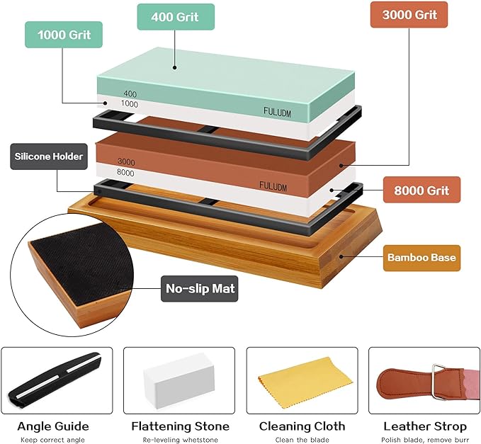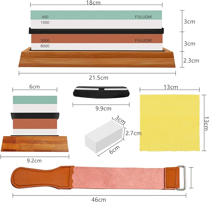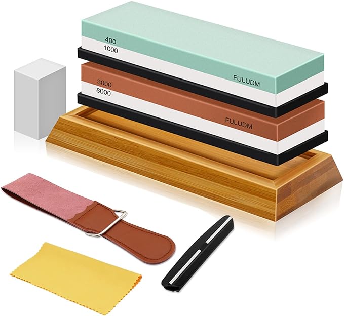 Dieses Set enthält zwei Schleifsteine mit 2-seitigen Körnungen (400/100 Grit und 3000/8000 Grit). Das robuste Unterteil besteht aus Bambus mit rutschfester Silikonbasis, wodurch der Schleifstein fest ist und zusätzliche Sicherheit und Komfort beim Schärfen bietet. In dem Set sind zudem ein Silikonhalter, eine Winkelführung, ein Abflachungsstein, ein Lederriemen sowie ein Reinigungstuch vorhanden. Dieser Abziehstein kann für jede Art von Küchenmesser, Taschenmesser, Kochmesser, Jagd- und Holzbearbeitungsmesser, Schere, Rasiermesser, Klingen, Axt verwendet werden. Durch die Schärfwinkelführung kann der richtige Winkel beibehalten und gleichmässiger Druck ausgeübt werden.