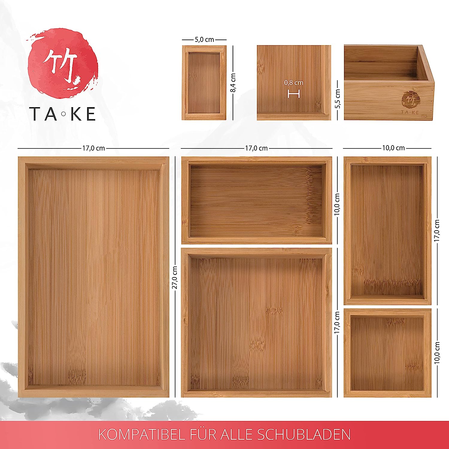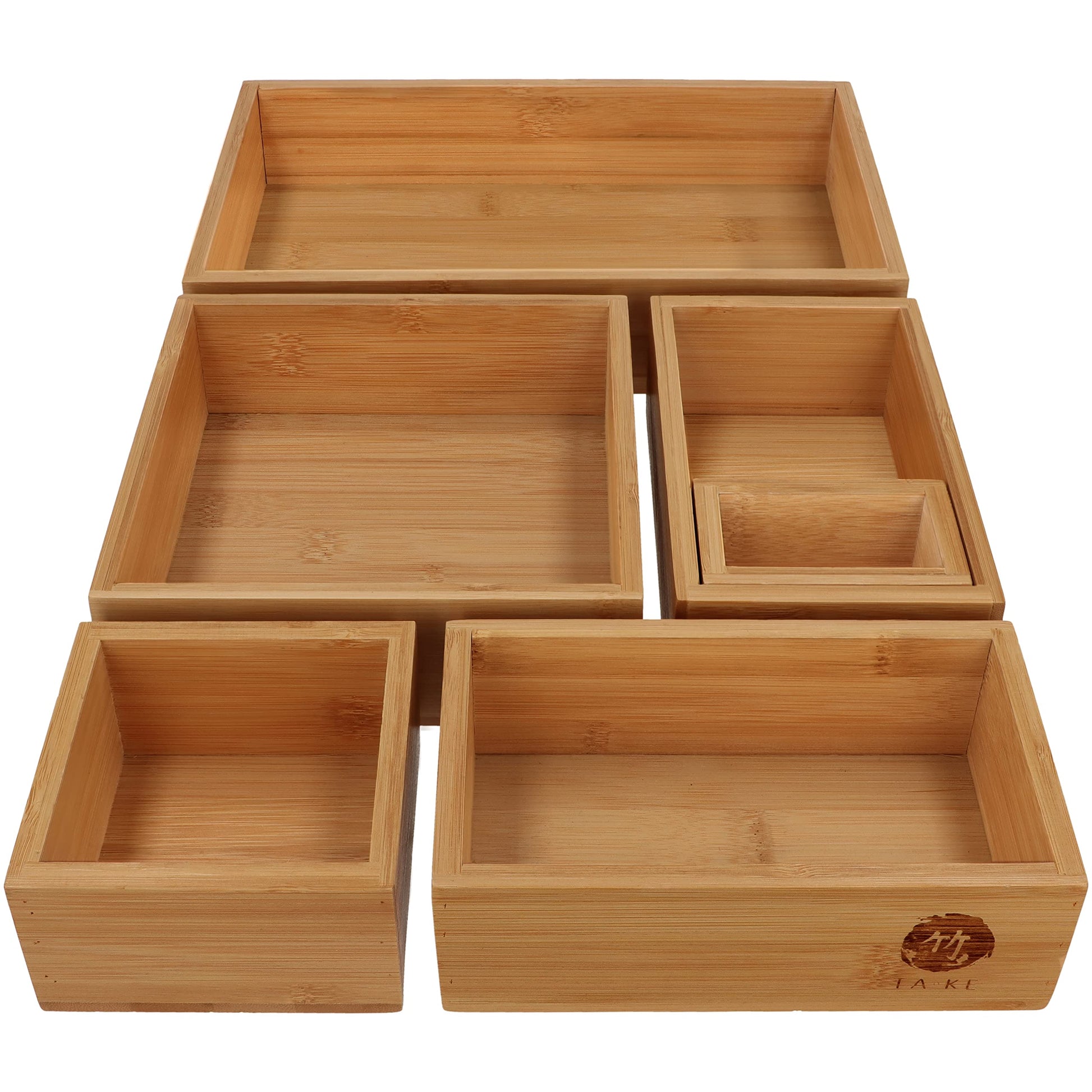 Dieses Set aus sechs Organisationsboxen aus Bambus bietet eine praktische Lösung für unordentliche Schubladen. Es eignet sich für die Aufbewahrung von Kosmetik, Gewürzen, Stiften und anderen kleinen bis mittelgrossen Gegenständen, die sich oft in Fächern und Schubladen ansammeln. Damit die Boxen nicht verrutschen und Kratzer auf glatten Oberflächen verursachen, sind im Lieferumfang Anti-Rutsch-Pads enthalten, die einfach auf jeder Box angebracht werden können. Die Masse der Boxen betragen 17 x 27 cm, 17 x 17 cm, zweimal 17 x 10 cm, 10 x 10 cm und 8.4 x 5 cm. Die Höhe beträgt dabei jeweils 5.5 cm.