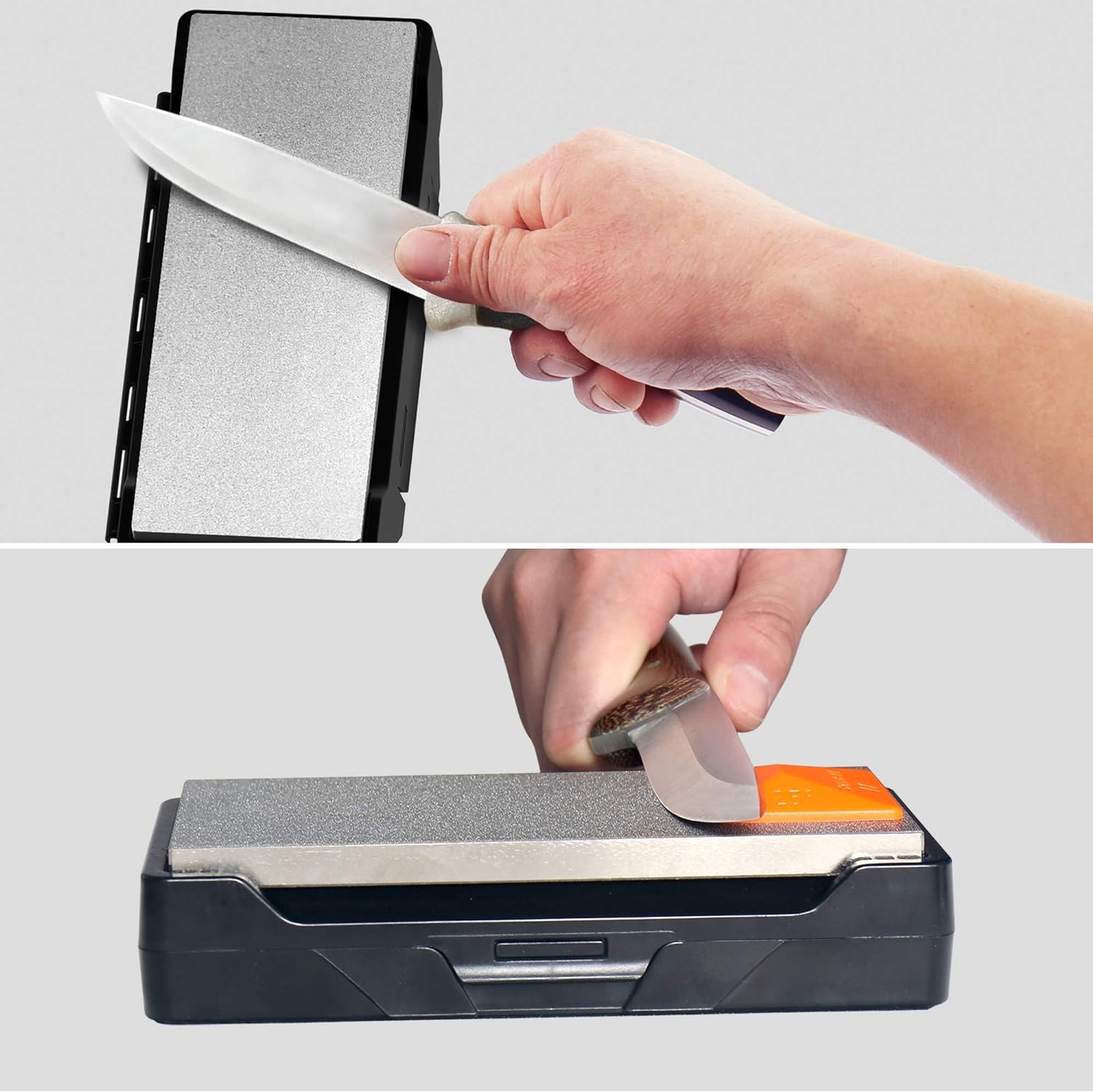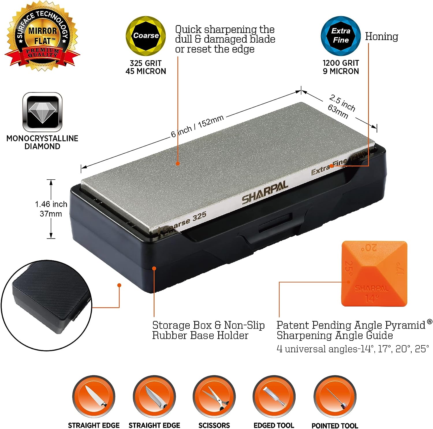 Der SHARPAL 156N Diamant-Schleifstein verfügt über eine Dual Körnung. Die grobe Körnung 325 (45 Mikron) ist für eine schnelle Klingenschärfung und die extrafeine Körnung 1200 (9 Mikron) zum Entgraten und Polieren geeignet. Die exklusive MirrorFlat-Technologie sorgt für eine sehr flache Oberfläche. Das Produkt enthält eine Aufbewahrungsbox mit 4 verschiedenen Winkelvorgaben und rutschfestem Gummipolster, die beim Schärfen als Arbeitsbasis verwendet werden kann. Der Schleifstein eignet sich zum Schärfen von Schnellarbeitsstahl, Hartmetall, Keramik und kubisches Bornitrid. Eine Anleitung ist im Lieferumfang enthalten. Es ist kein Öl oder Wasser erforderlich. Die Masse betragen 15,2 cm x 6,3 cm.