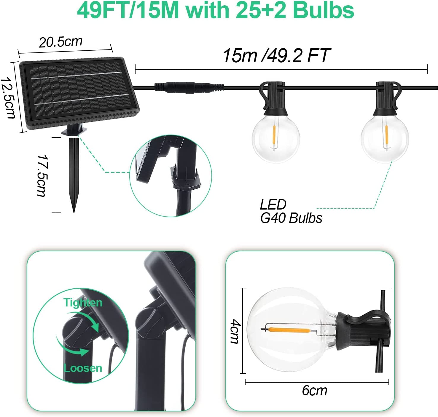 Die GHUSTAR Solar-Lichterkette ist eine 15 Meter lange Beleuchtungslösung, die sowohl für den Innen- als auch den Aussenbereich geeignet ist. Mit einem leistungsstarken 3.5 Watt Solarmodul kann diese Lichterkette tagsüber Sonnenenergie einfangen und speichern. Dabei sind die Lichter ausgeschaltet und schalten sich erst bei Einbruch der Dunkelheit automatisch an. Zusätzlich zur Solarladung besteht die Möglichkeit, die Lichterkette über USB aufzuladen. Das Solarpanel ist abnehmbar und ermöglicht eine flexible Platzierung und Positionierung, um maximale Sonneneinstrahlung zu gewährleisten. Die Lichterkette ist mit insgesamt 25 + 2 Glühbirnen ausgestattet. Sie kann im Konstantlichtmodus verwendet werden oder alternativ in einem von drei Blinkmodi: langsames, schnelles und kontinuierliches Blinken. Darüber hinaus sind die Glühbirnen dieser Lichterkette bruchsicher und wasserdicht, was sie äusserst langlebig und widerstandsfähig macht.