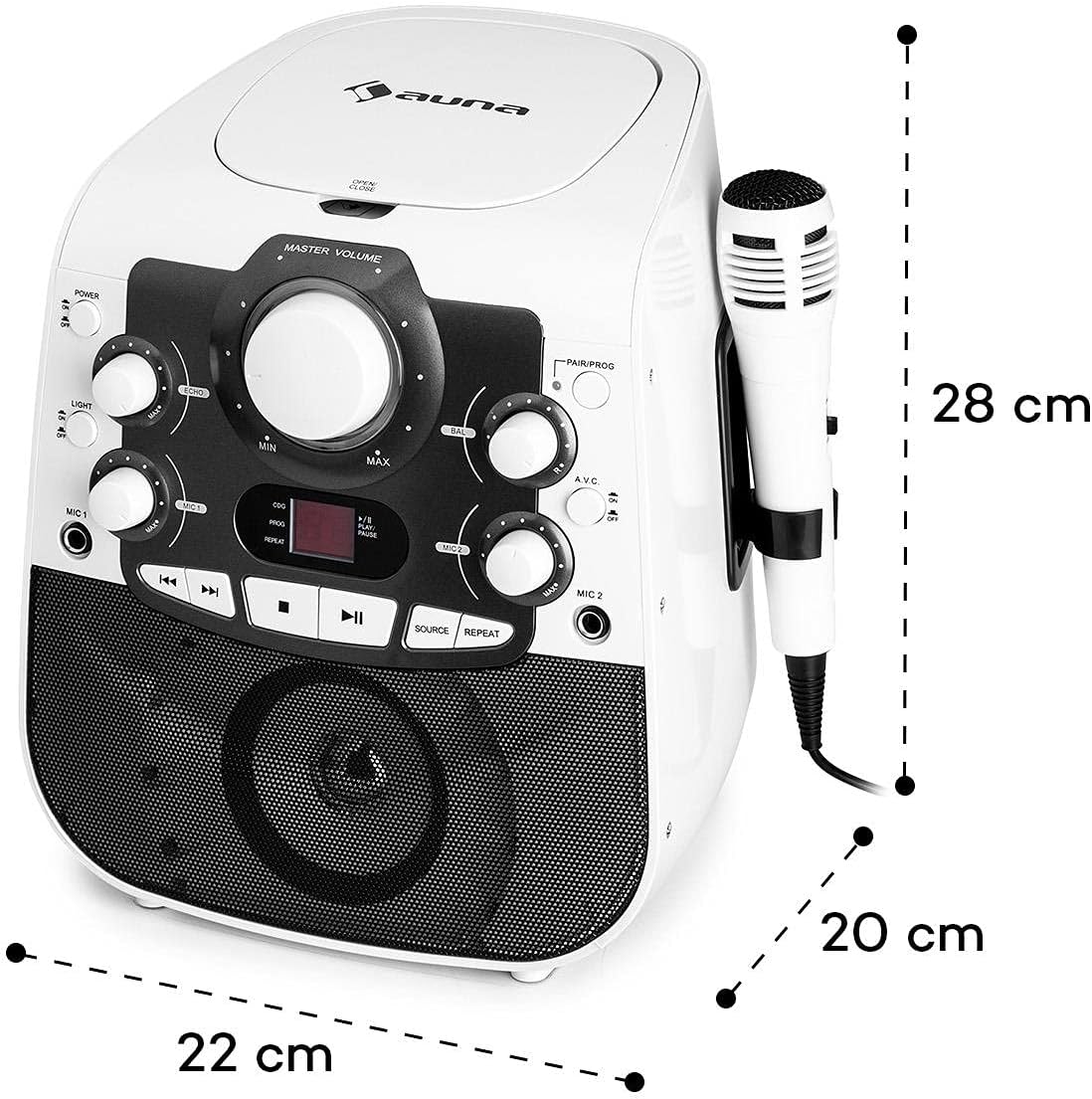 Die auna StarMaker 2.0 Karaoke-Anlage bietet mit ihrer Bluetooth-Funktion eine moderne Möglichkeit, Musik zu streamen und Karaoke zu geniessen. Ausgestattet mit einem CD-Player, der neben Standard-CDs auch CD+G und CD-RW abspielt, wird jedes Musikformat unterstützt. Eine integrierte LED-Show und zwei Mikrofon-Eingänge ermöglichen es, allein oder im Duett zu performen, wobei man mit den 6,3mm-Klinken-Eingängen die Kontrolle über Lautstärke und Echo behält. Für die richtige Soundausgabe sorgen die frontseitigen Lautsprecher mit 3 Watt RMS-Leistung, die durch externe Geräte ergänzt werden können. Der A/V-Ausgang am Gerät ermöglicht zudem die Verbindung mit einem Beamer oder Fernseher für das ultimative Karaoke-Erlebnis. Ideal für jede Feier, vom Kindergeburtstag bis zum Familienfest.