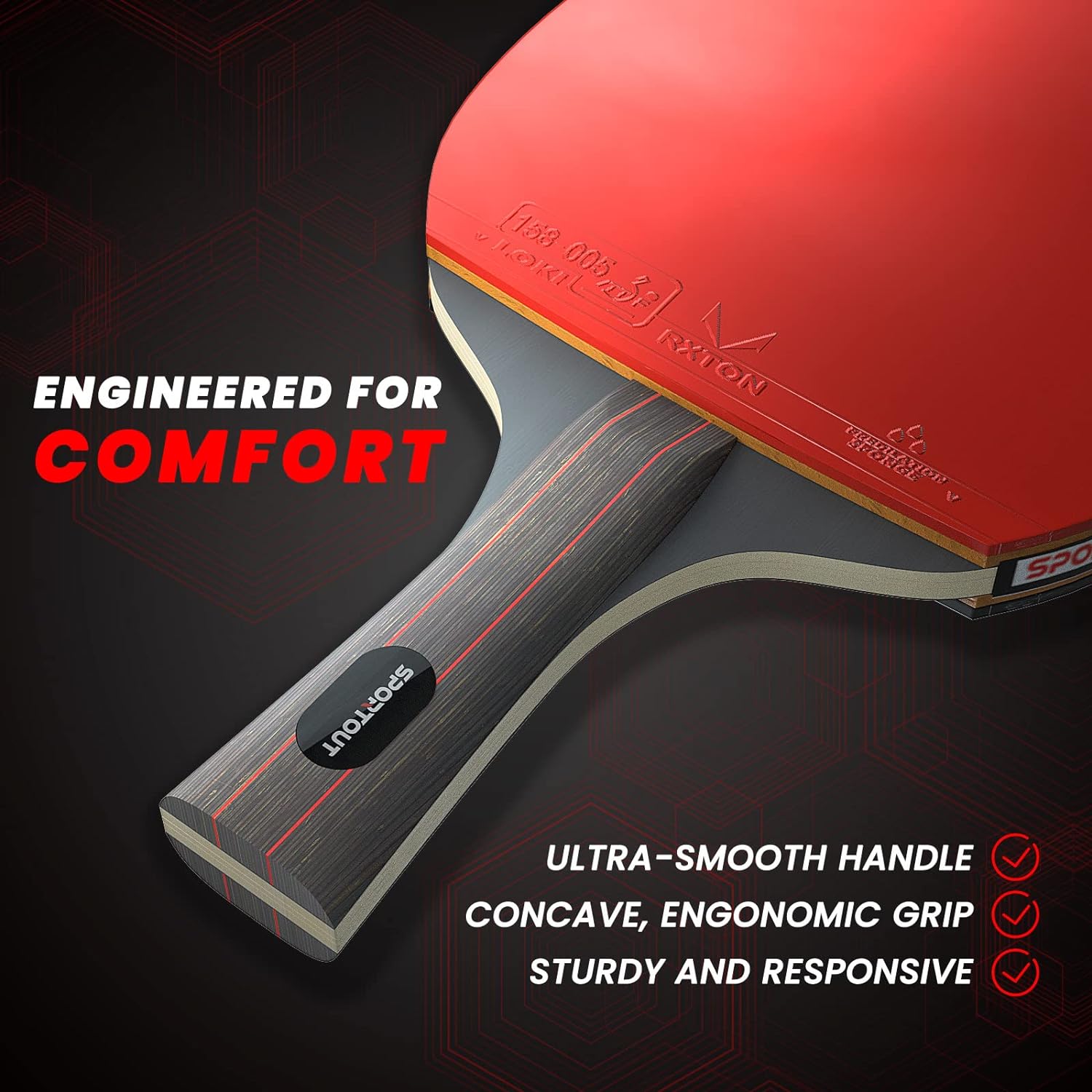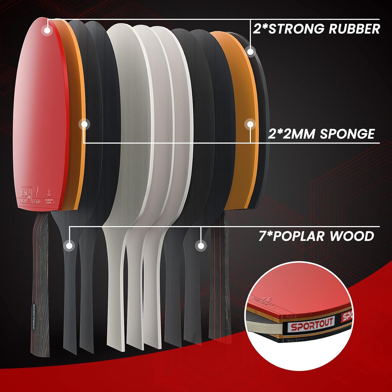 Das Tischtennisschläger-Set von Sportout bietet vier hochwertige Schläger, ausgestattet mit einem elastischen 2mm Schwamm und doppelseitigem Premium-Gummi für optimale Ballkontrolle. Die Schlägerblätter sind aus robustem 7-lagigem Pappelholz gefertigt. Im Set enthalten sind auch acht Tischtennisbälle und eine praktische Tragetasche für den bequemen Transport.