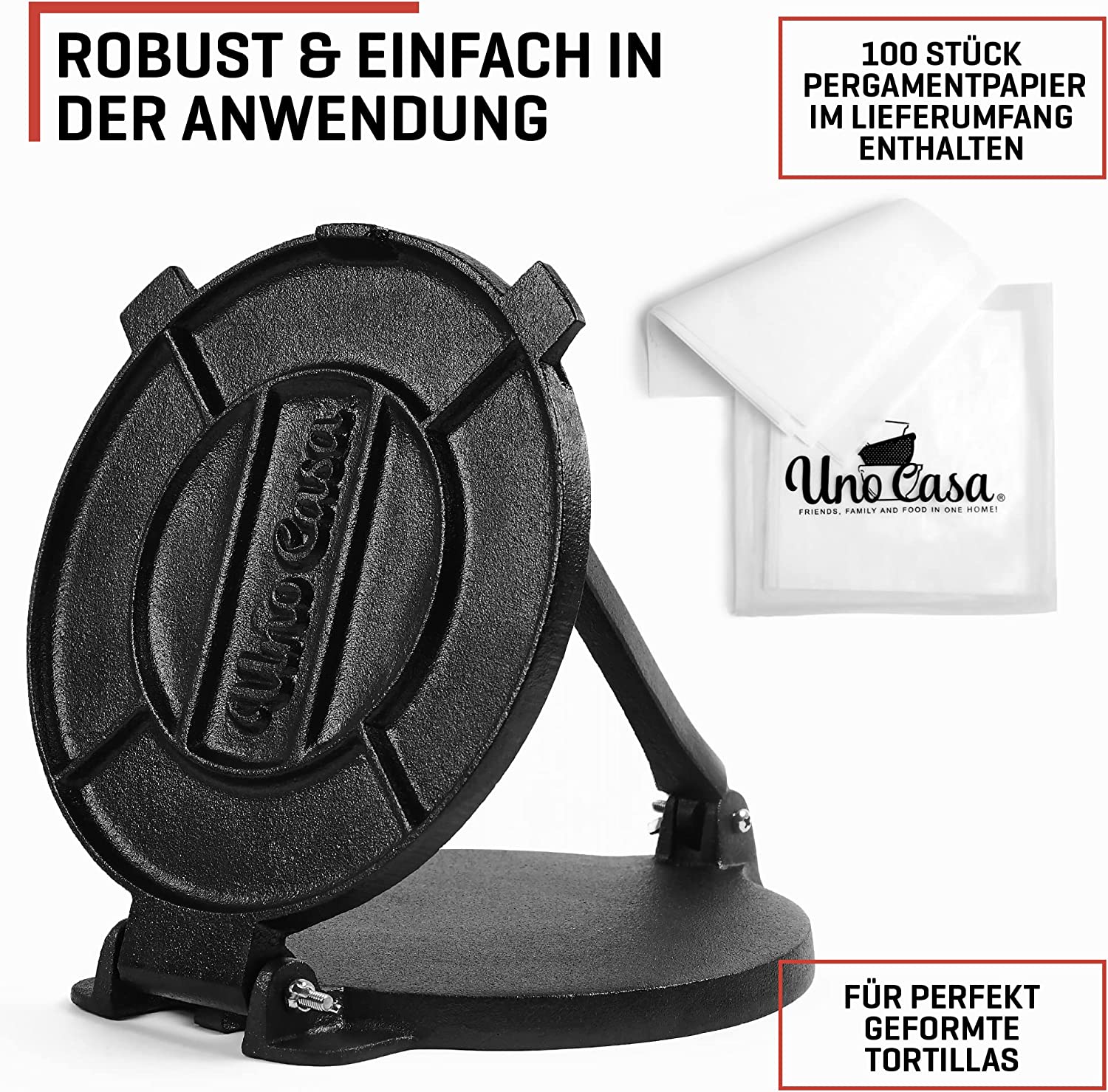 Die Tortilla-Presse besteht aus Gusseisen, hat einen Durchmesser von 20 cm und wiegt 3.26 kg. Sie ist beschichtet und kann sofort verwendet werden. Im Lieferumfang befinden sich zusätzlich 100 Stück Pergamentpapier und ein zusätzlicher Schraubensatz.