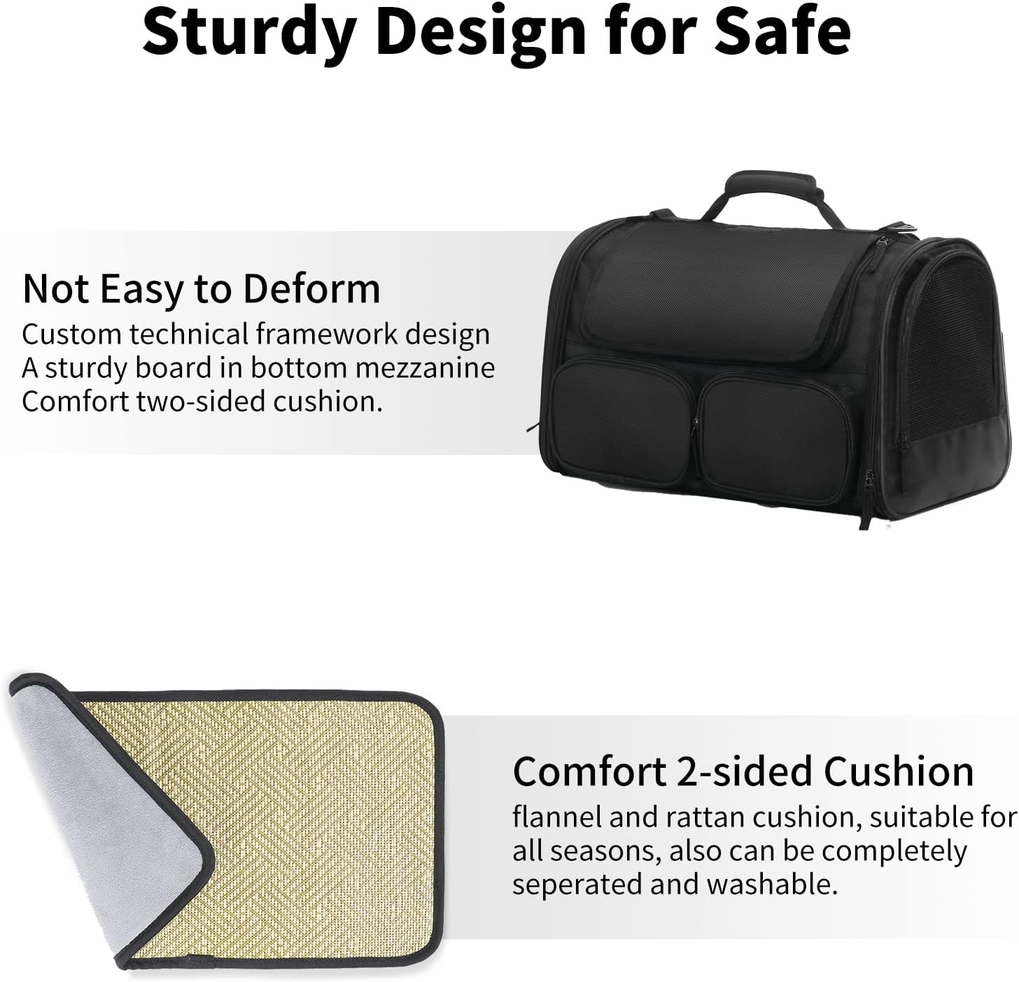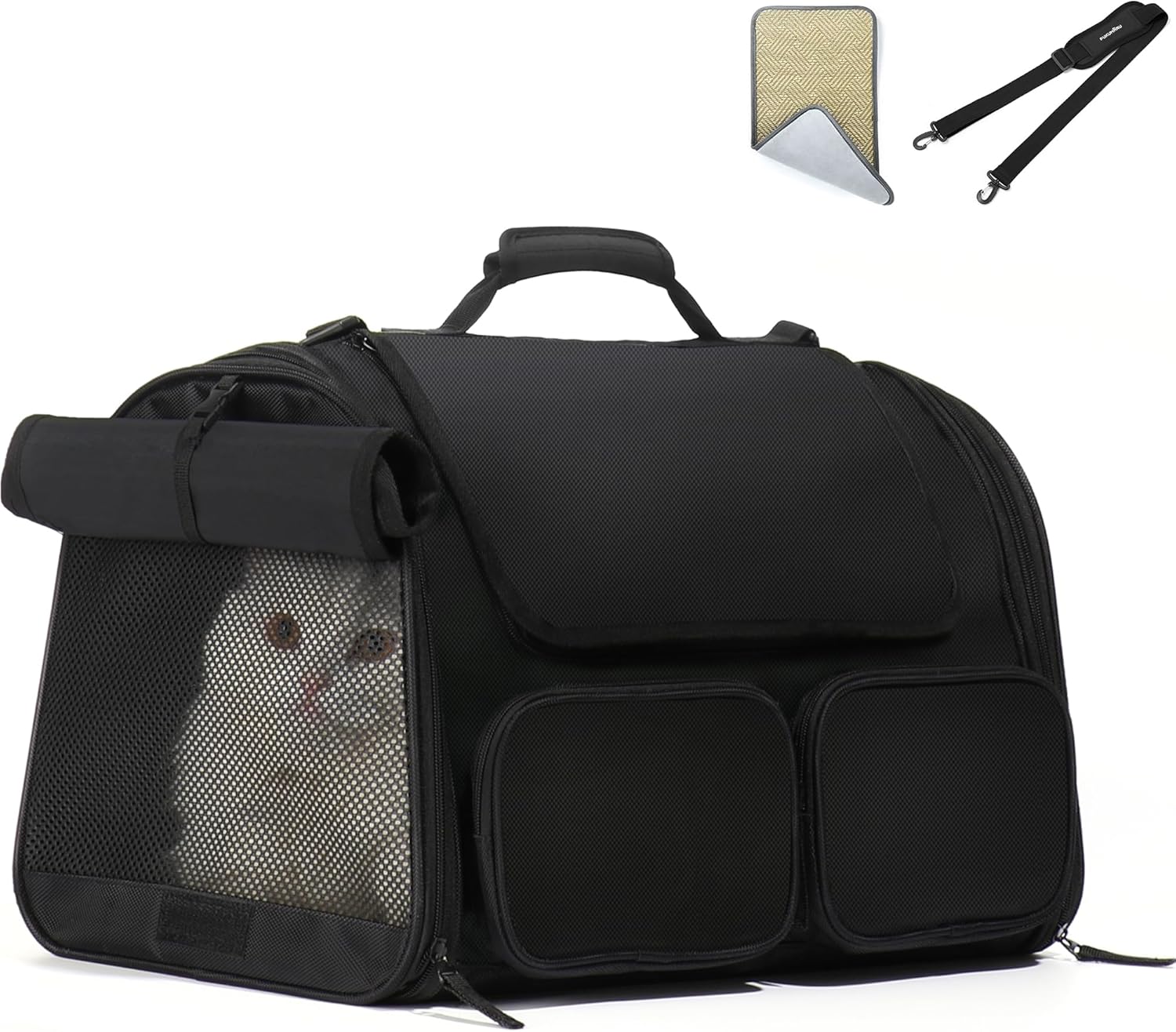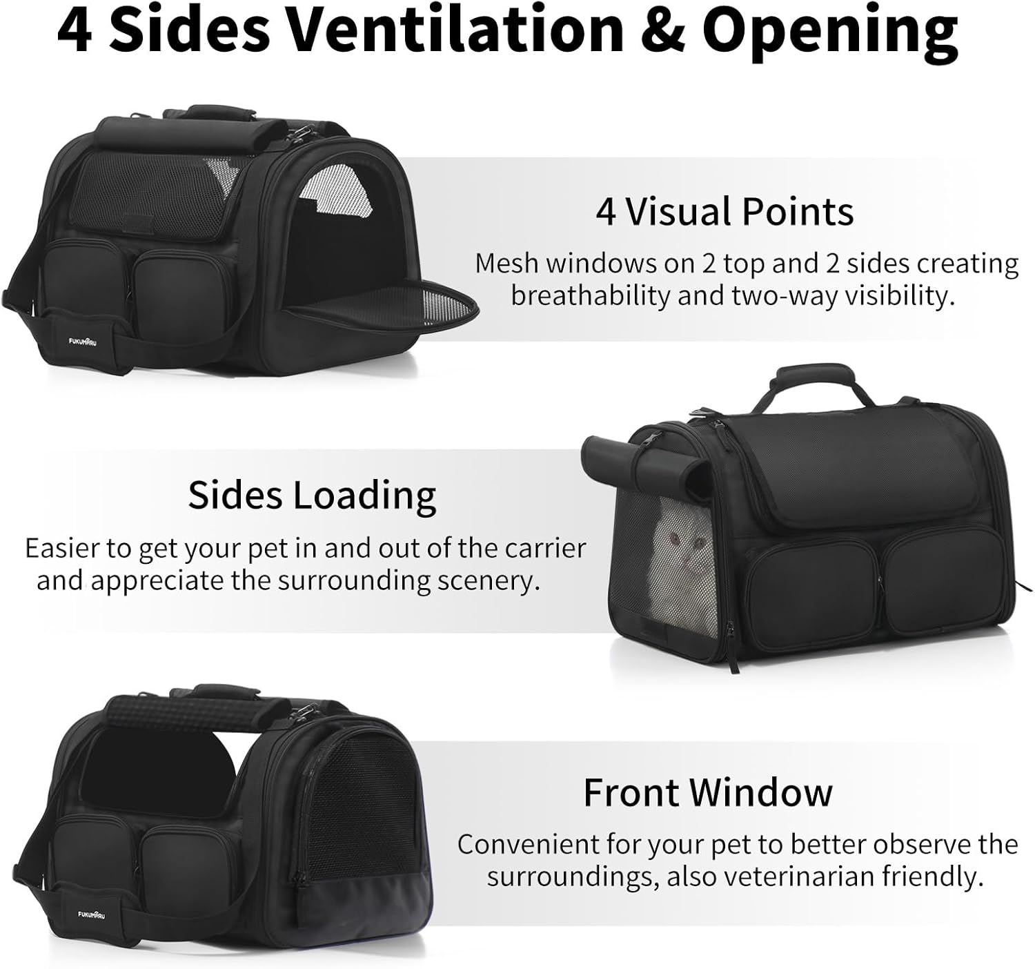 Die Transportbox von FUKUMARU bietet eine praktische Lösung für die Beförderung von kleinen bis mittelgrossen Haustieren bis zu einem Gewicht von 20 kg. Der faltbare Träger misst 44,5 x 30 x 29 cm und ist aus einem widerstandsfähigen, wasserfesten Oxford-Stoff gefertigt. Das Netz sorgt für eine ausreichende Belüftung. Die Reisetasche verfügt über vier Eingangstüren und ein gemütliches, saisonal anpassbares und waschbares Haustierbett. Zudem erleichtern ein gepolsterter Schultergurt und Handgriffe den Transport. Die Einhaltung von Fluglinienstandards machen diese Box zu einer verlässlichen Wahl für Haustierbesitzer.