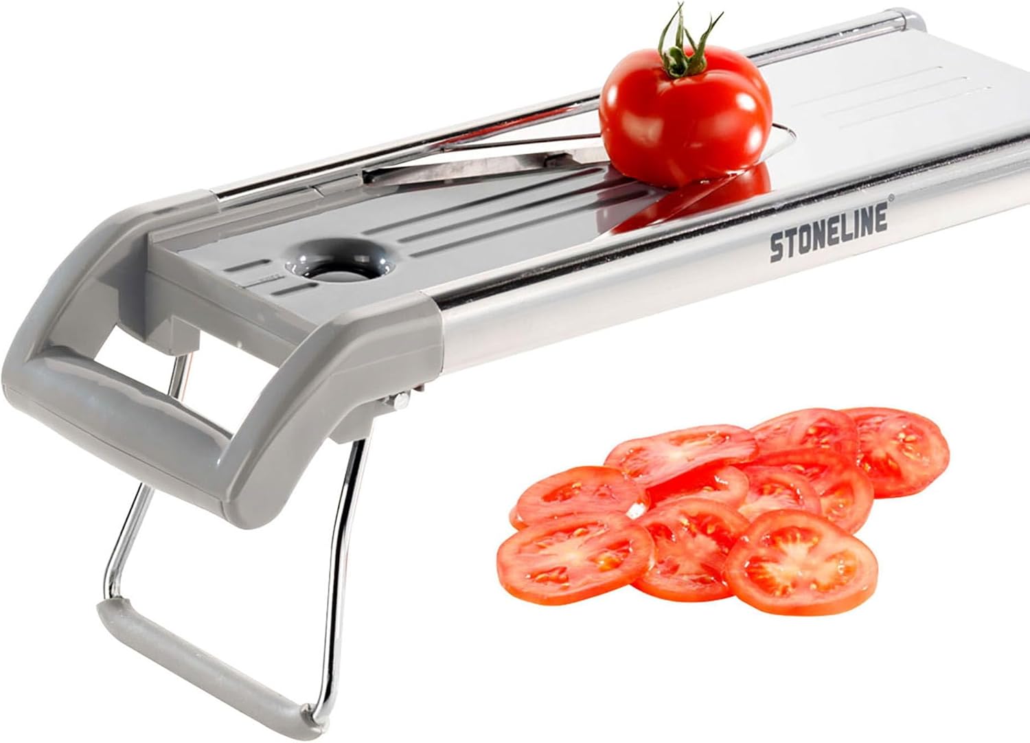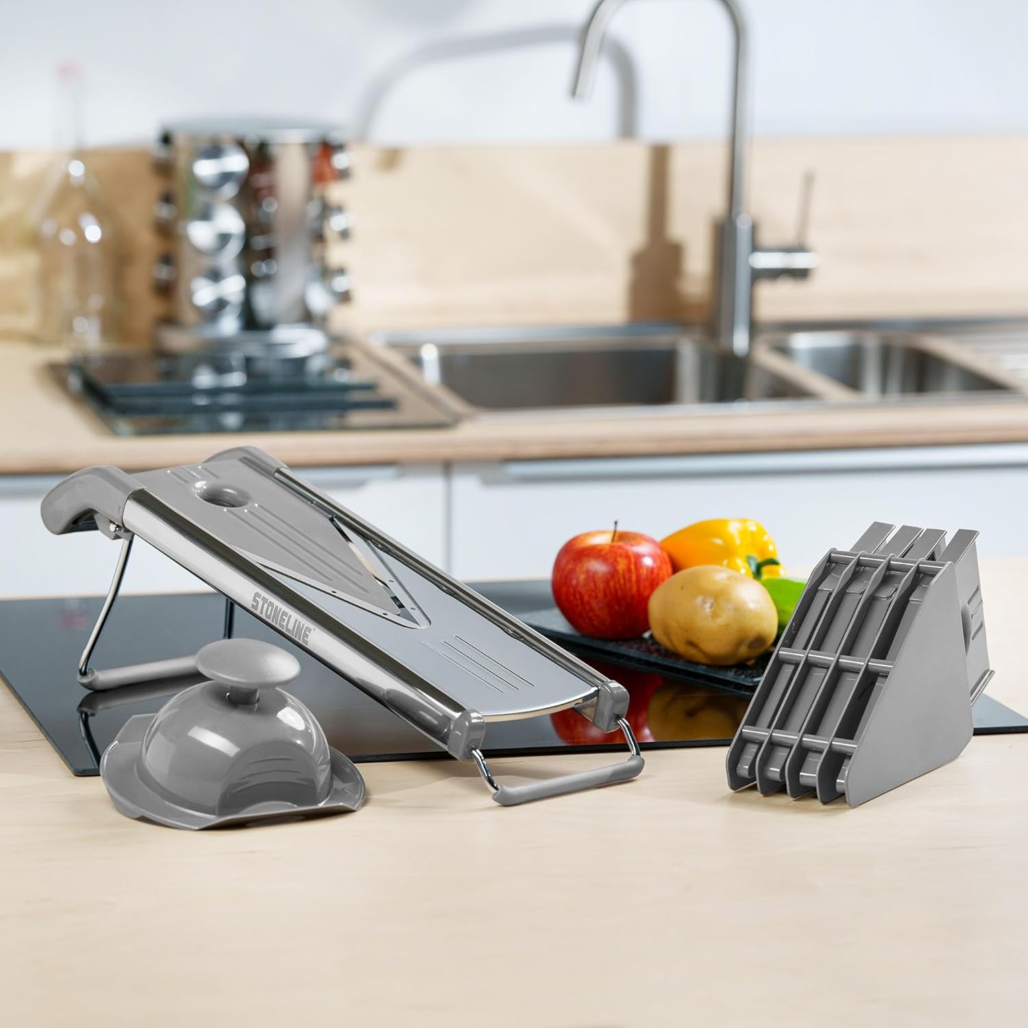 Das STONELINE V-Hobel Set mit 9 Teilen ist ein Multitalent für die Küche. Ausgestattet mit fünf unterschiedlichen Schneideinsätzen sowie einem präzisen V-Messer aus rostfreiem Edelstahl, ermöglicht es eine Vielzahl von Schnitten – von feinen Julienne-Streifen bis zu gleichmässigen Würfeln. Ein Fingerschutzhalter minimiert das Verletzungsrisiko, während der klappbare, rutschfeste Fuss des Hobels Flexibilität bietet: so kann er auf einer Arbeitsfläche oder direkt über einer Schüssel genutzt werden. Die kompakte Bauweise erlaubt es, das Set selbst auf Reisen leicht zu verstauen.