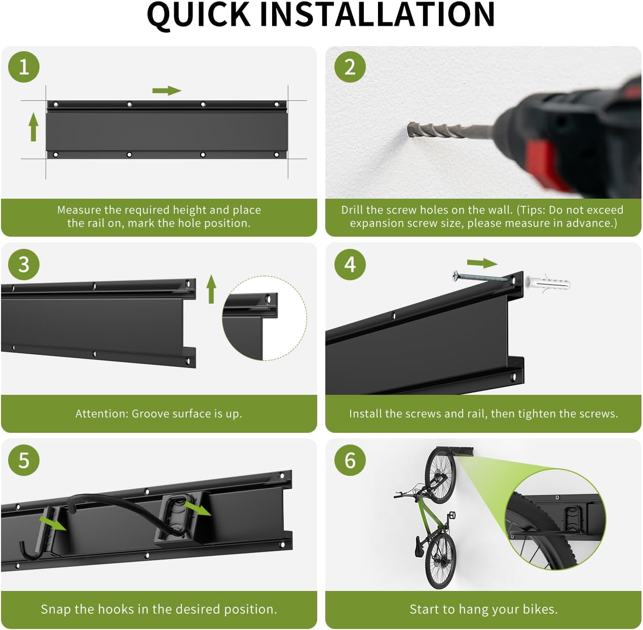 Die Fahrrad-Wandhalterung aus legiertem Stahl bietet eine effiziente Lösung zur Aufbewahrung von Fahrrädern in Garagen, Wohnungen, Häusern oder Schuppen. Die Wandmontage ermöglicht eine platzsparende Lagerung und hält bis zu sechs Fahrräder sicher an ihrem Platz. Die pulverbeschichtete Oberfläche sorgt für Kratzfestigkeit und Rostbeständigkeit, was die Langlebigkeit des Produkts erhöht. Zur Befestigung werden Schrauben und Erweiterungsrohre genutzt, die eine stabile Montage gewährleisten. Der Lieferumfang beinhaltet sechs Fahrradhaken, fünf Helmhaken, drei Hakenleisten, 24 Schrauben und Erweiterungsrohre sowie eine Bedienungsanleitung.