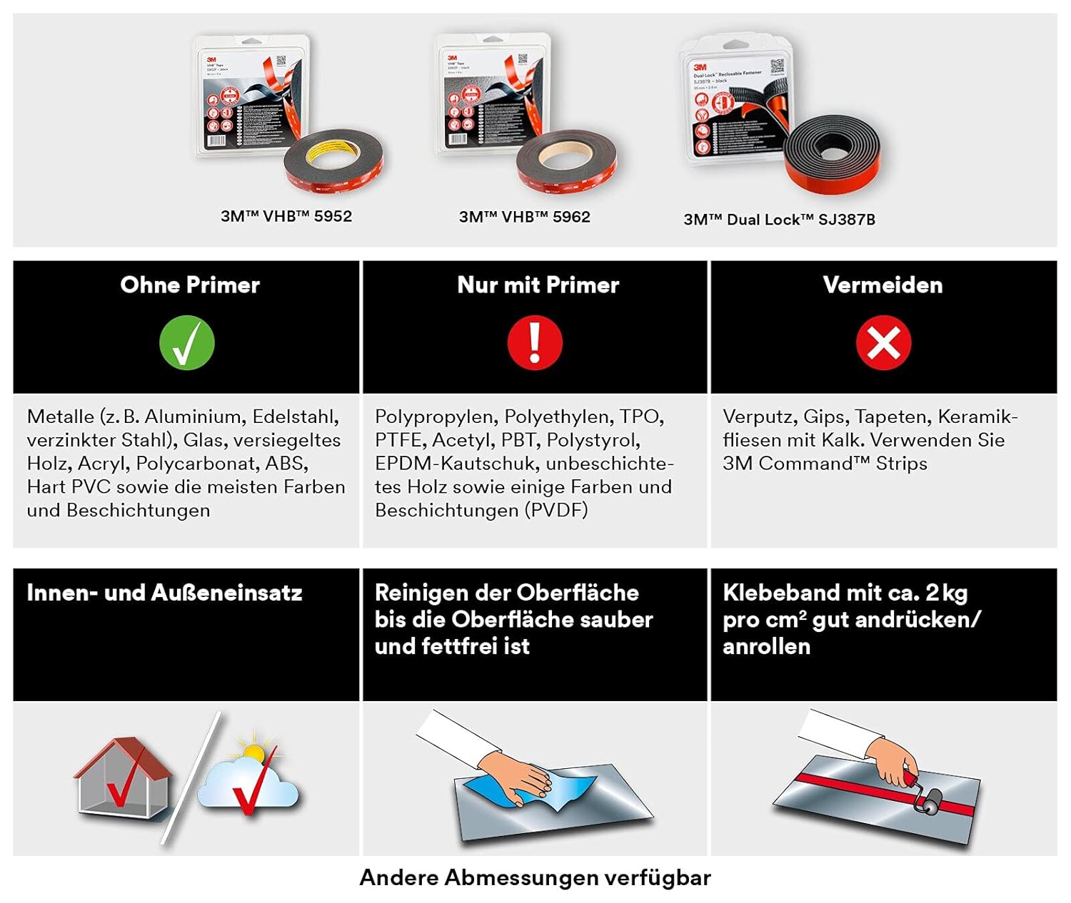 3M VHB Hochleistungs-Klebebänder sind doppelseitige Klebebänder aus geschlossenzelligem Acrylat-Klebstoff. Sie bieten sehr hohe Anpassungsfähigkeit an die zu klebenden Oberflächen. Glatte oder strukturierte Oberflächen lassen sich vollflächig spannungsfrei verbinden. Sie sind ideal geeignet für viele niederenergetische Oberflächen, pulverlackierte Oberflächen, Kunststoffe (kein Weich-PVC) oder Glas. In vielen Anwendungen kann auf die Verwendung von Primern verzichtet werden.