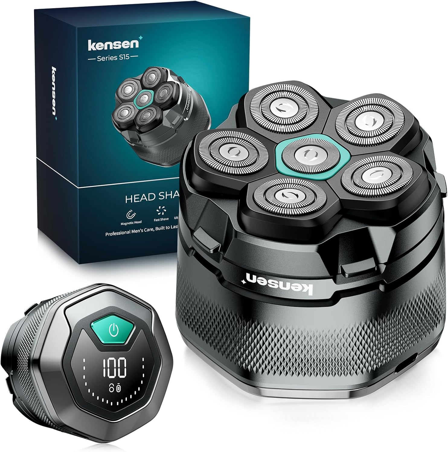 Der Kensen Glatzenrasierer bietet eine präzise, hautschonende Rasur dank aufgerüstetem 6D-Schwimmkopf mit gebogenen Klingen. Die LED-Anzeige informiert über Akkustand und Laufzeit, während eine Sperrfunktion ungewolltes Einschalten verhindert. Das wasserdichte Design ermöglicht die Nutzung unter der Dusche, der magnetische Kopf erleichtert die Reinigung. Mit bis zu 160 Minuten Laufzeit, 1400 mAh Akku und USB-C-Ladung ist er besonders komfortabel.