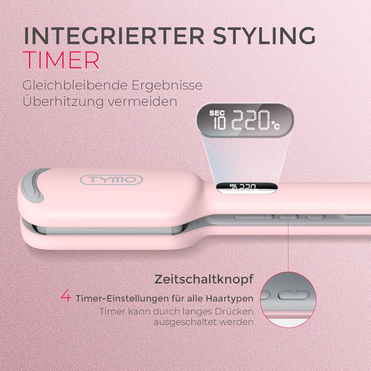 Das TYMO ROVY Welleneisen in Rosa verbindet Stil mit Funktionalität und ermöglicht es Anfängern, mühelos voluminöse Beach Waves zu kreieren. Mit einem 25 mm Fass für grössere Locken und einer zweiseitigen Heiztechnologie sorgt es für langlebige, natürliche Ergebnisse. Fünf einstellbare Temperaturstufen von 140°-220 °C, angezeigt auf einem LED-Display, geben präzise Kontrolle für verschiedene Haartypen. Die schnelle Aufheizung in nur 30 Sekunden durch vier PTC-Heizelemente, ein gleichmässiges Heizsystem, und der Schutz vor Überhitzung des Haares heben die Benutzerfreundlichkeit hervor. Eine spezielle Turmalin-Keramikbeschichtung setzt negative Ionen frei, um statische Aufladung zu reduzieren und das Haar glänzend zu halten. Das isolierte Gehäuse schützt vor Verbrennungen und lässt professionelle Wellen ohne grossen Aufwand entstehen. Das Gerät bietet ein einfaches, schnelles und sicheres Styling für alle Haartypen und verleiht jedem Look anhaltendes Volumen.