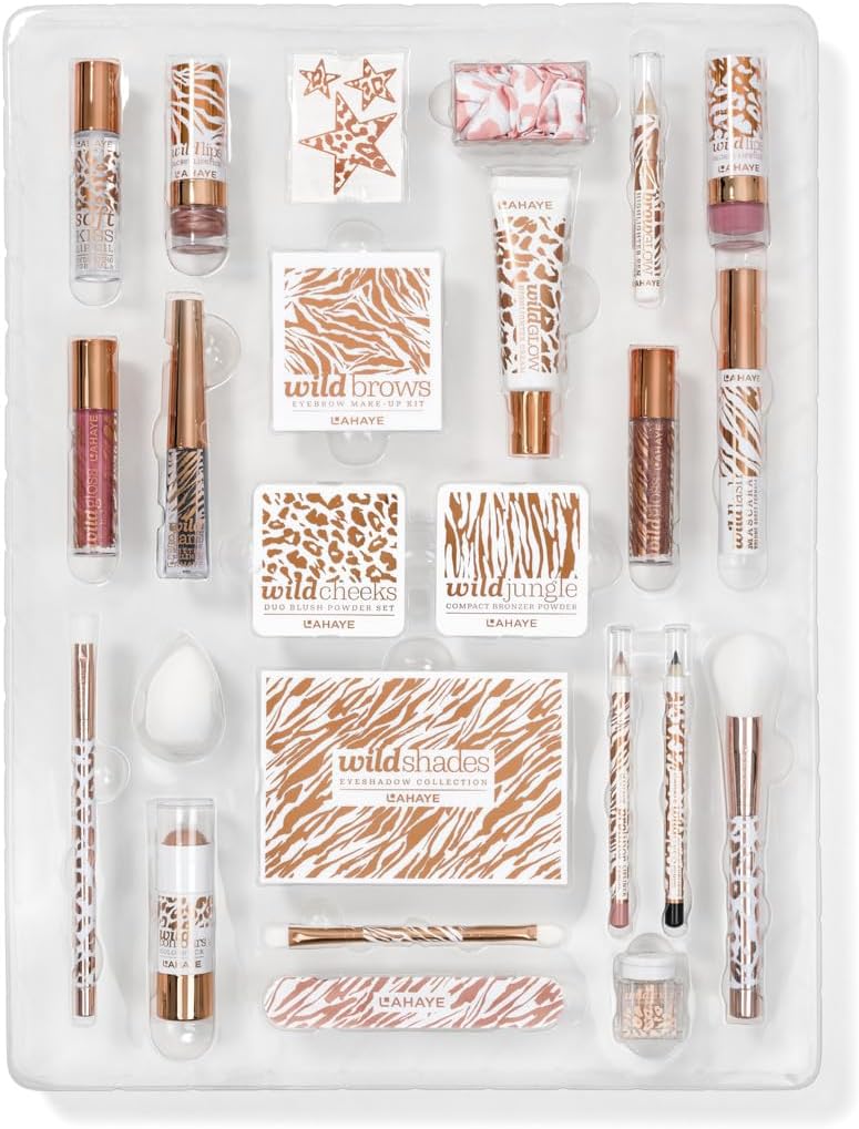 Der LAHAYE Beauty Adventskalender "WILD X-MAS" 2024 bereichert mit 24 ausgewählten, veganen und tierversuchsfreien Beauty-Produkten die Vorweihnachtszeit. In seiner Zusammenstellung birgt der "WILD X-MAS" 2024 Kalender echte Schätzchen: von einer Eyeshadow Palette mit zwölf Trendfarben über ein Duo Blush Powder bis hin zu einer volumenverleihenden Mascara und Make-up Pinseln im Leopardenstil. Auch das Brow Eyebrow Kit oder der schimmernde Highlighter sind Teil dieser Selektion, die sämtliche Beauty-Bedürfnisse abdeckt.