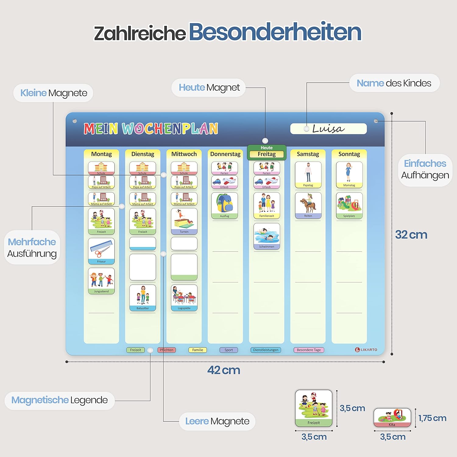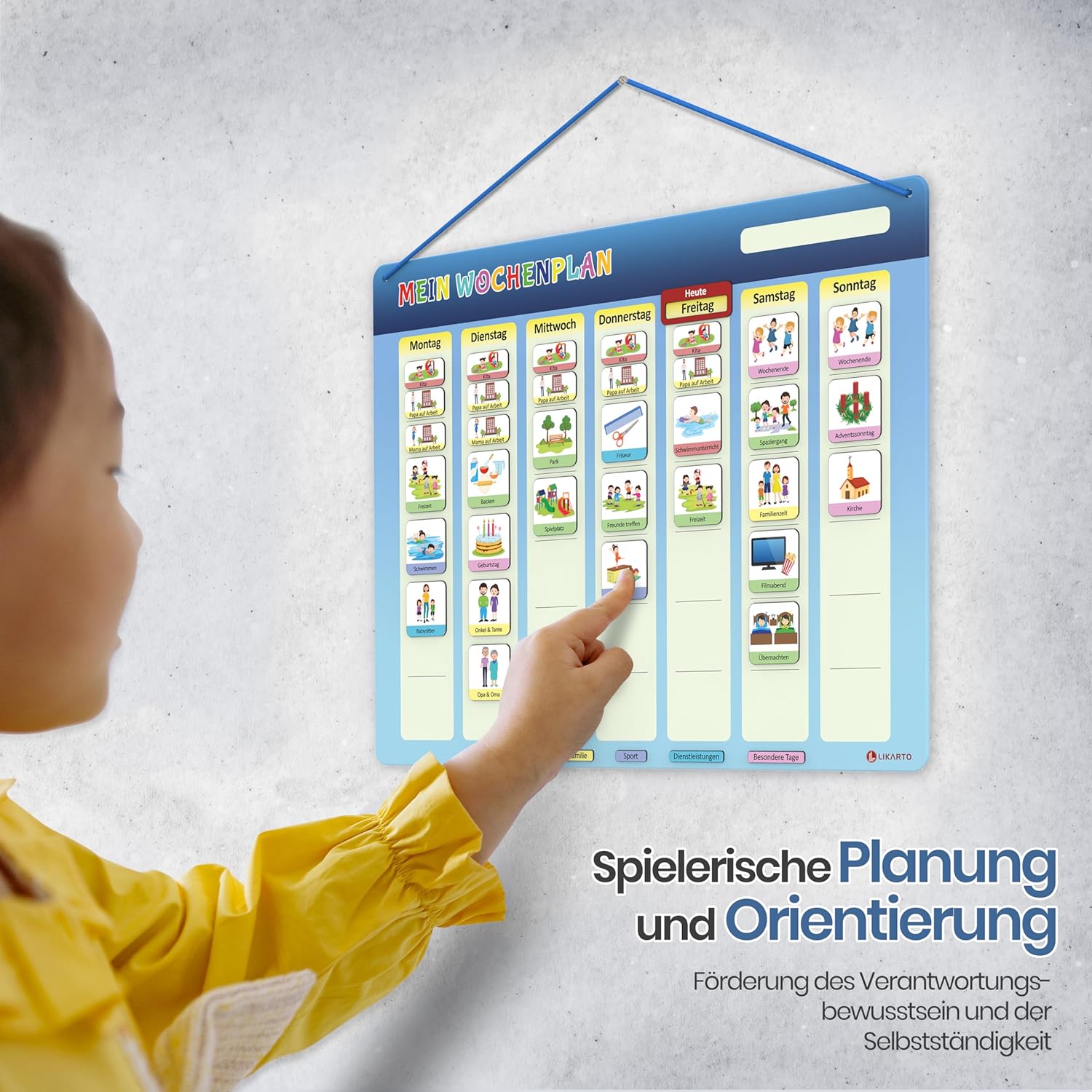 Der LIKARTO Wochenplaner für Kinder ist darauf ausgerichtet, Verantwortungsbewusstsein und Organisationsfähigkeit auf natürliche Weise zu stärken. Mit mehr als 190 Magneten bietet der Planer eine breite Palette zur Individualisierung für jede Familie. Farbenfrohe Motive unterstützen zudem das intuitive Verstehen von Alltagsstrukturen für Kinder, selbst ohne Lesefähigkeiten. Die magnetische Befestigungsart sorgt dafür, dass der Planer flexibel an verschiedenen Orten, wie beispielsweise am Kühlschrank, angebracht werden kann. Das klassische Design spricht alle Altersgruppen an und fügt sich nahtlos in verschiedene Wohnumgebungen ein. Der Wochenplaner ist speziell auf die Bedürfnisse von Kindern abgestimmt und unterstützt sie dabei, ihre täglichen Aufgaben und Termine im Blick zu behalten.