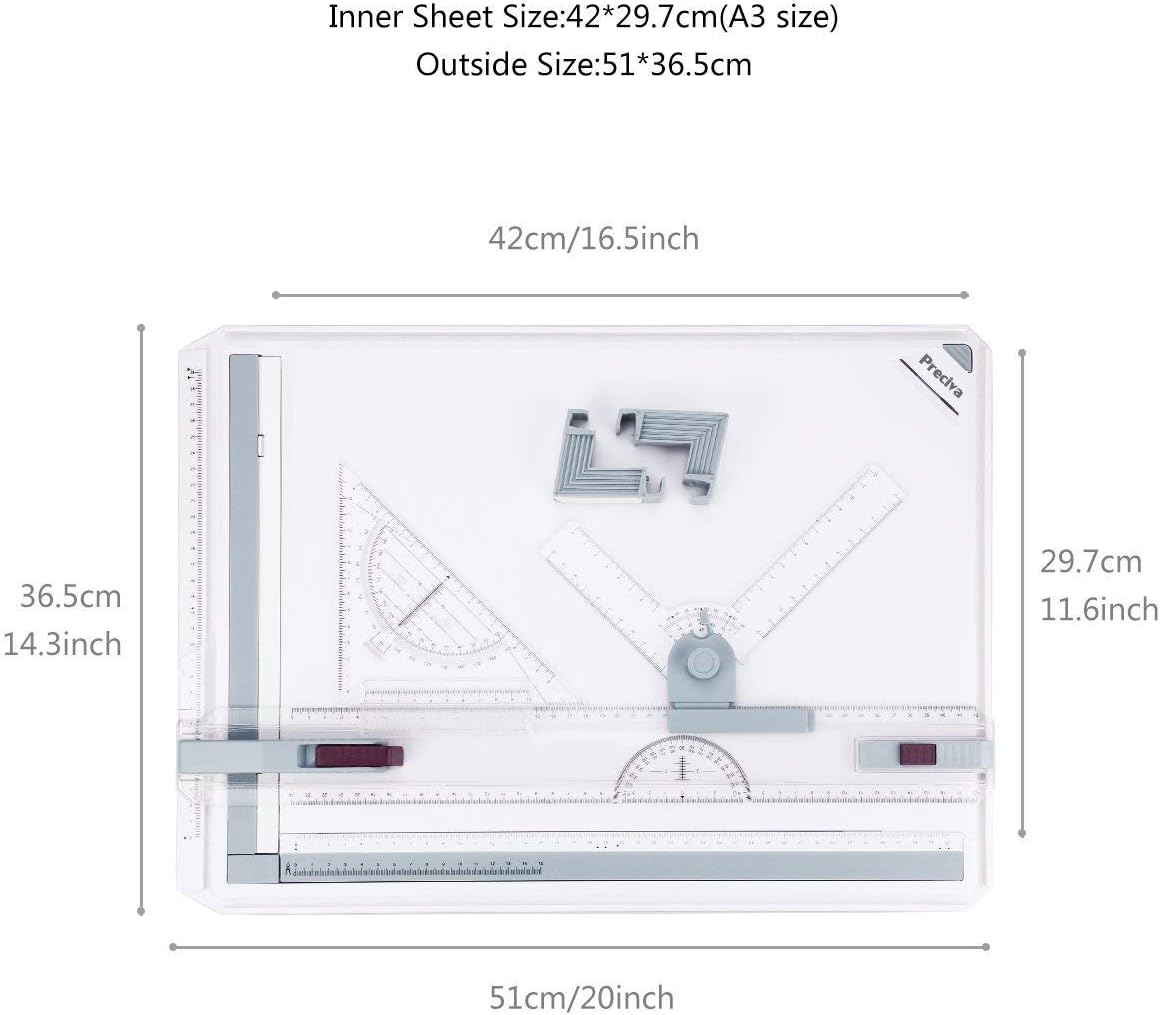 Das A3-Zeichenbrett-Set mit metrischem System bietet dank der Doppelverriegelung die Möglichkeit, Zeichnungen für Design-, Skizzier- oder Heimwerkerprojekte in verschiedenen Winkeln herzustellen, ohne dass etwas verrutscht. Neben dem Zeichenbrett und der Hauptschiene sind auch noch ein Winkelzeichner und ein Zeichendreieck enthalten. Die Masse des Produkts betragen 51 x 36.5 cm bei einem Gewicht von 1.7 Kilogramm. Hinter dem Brett befinden sich 8 kleine Antirutschmatten. Die beiden Klappständer lassen sich auf 2 verschiedene Höhen einstellen.