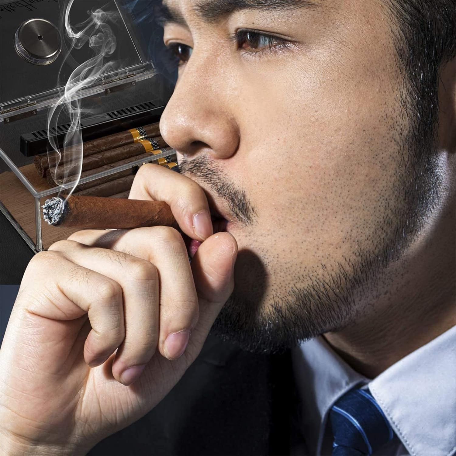 Der Zigarrenhumidor besteht aus transparentem Acrylmaterial, das eine klare Sicht auf den Inhalt ermöglicht. Ausgestattet mit einem einstellbaren Hygrometer bietet er die Möglichkeit, den Feuchtigkeitszählwert nach Bedarf anzupassen. Das Hygrometer ist praktisch auf der Oberseite des Deckels installiert, um eine einfache Anzeige der Luftfeuchtigkeitszählung zu gewährleisten. Mit Abmessungen von 21.1 cm in der Länge, 13 cm in der Breite und 8.9 cm in der Höhe bietet dieser Humidor ausreichend Platz für etwa 20 Zigarren, abhängig von ihrer Grösse. Die kompakte Grösse macht ihn leicht zu transportieren. Das Produktgewicht beträgt 940 Gramm.